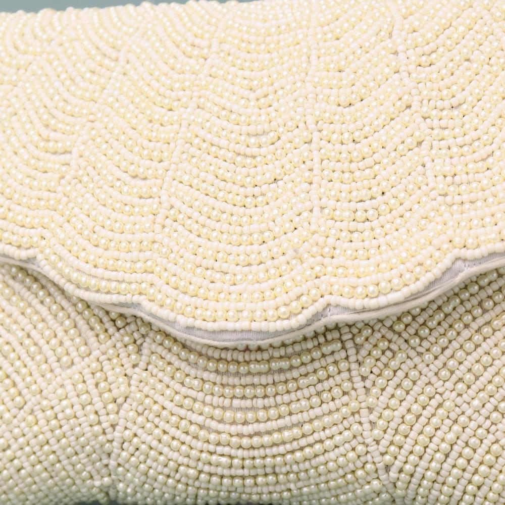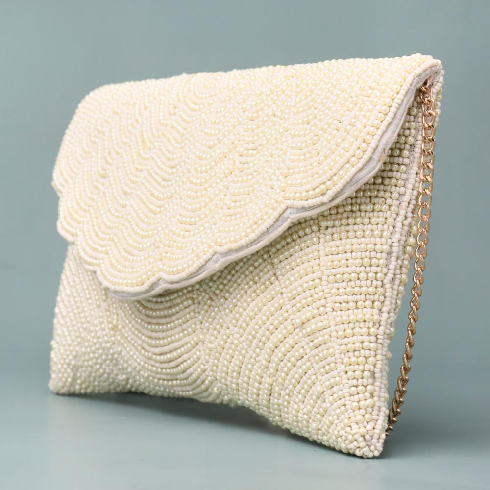 Step into timeless sophistication with the Ivory Scallop Elegance Beaded Clutch. Adorned with hand-stitched ivory beads in a graceful scalloped flap design, this clutch brings understated luxury to any ensemble. Whether paired with ethnic wear or a sleek evening dress, the addition of a detachable gold-toned chain strap ensures it transitions seamlessly from clutch to crossbody—offering both style and convenience.