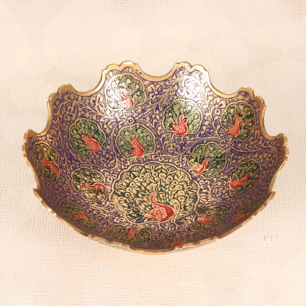 Make a statement with the Jaipur Art brass fruit bowl and its vivid hand-carved peacock design. This elegant bowl elevates any space with artisanal craftsmanship and colorful flair. Each Jaipur Art fruit bowl is a handcrafted work of art, featuring a one-of-a-kind carved and enameled peacock design. The intricate brasswork and vibrant enameling is done by artisans in India, using traditional techniques to create a truly unique decorative accent. The bowl's generous size provides ample space for fresh fruit, while the durable brass construction ensures lasting beauty. Place this bowl on your entryway table or kitchen countertop to infuse your home with exotic Indian style. With its artisanal craftsmanship and vibrant colors, this fruit bowl from Jaipur Art is sure to spark conversation and delight.