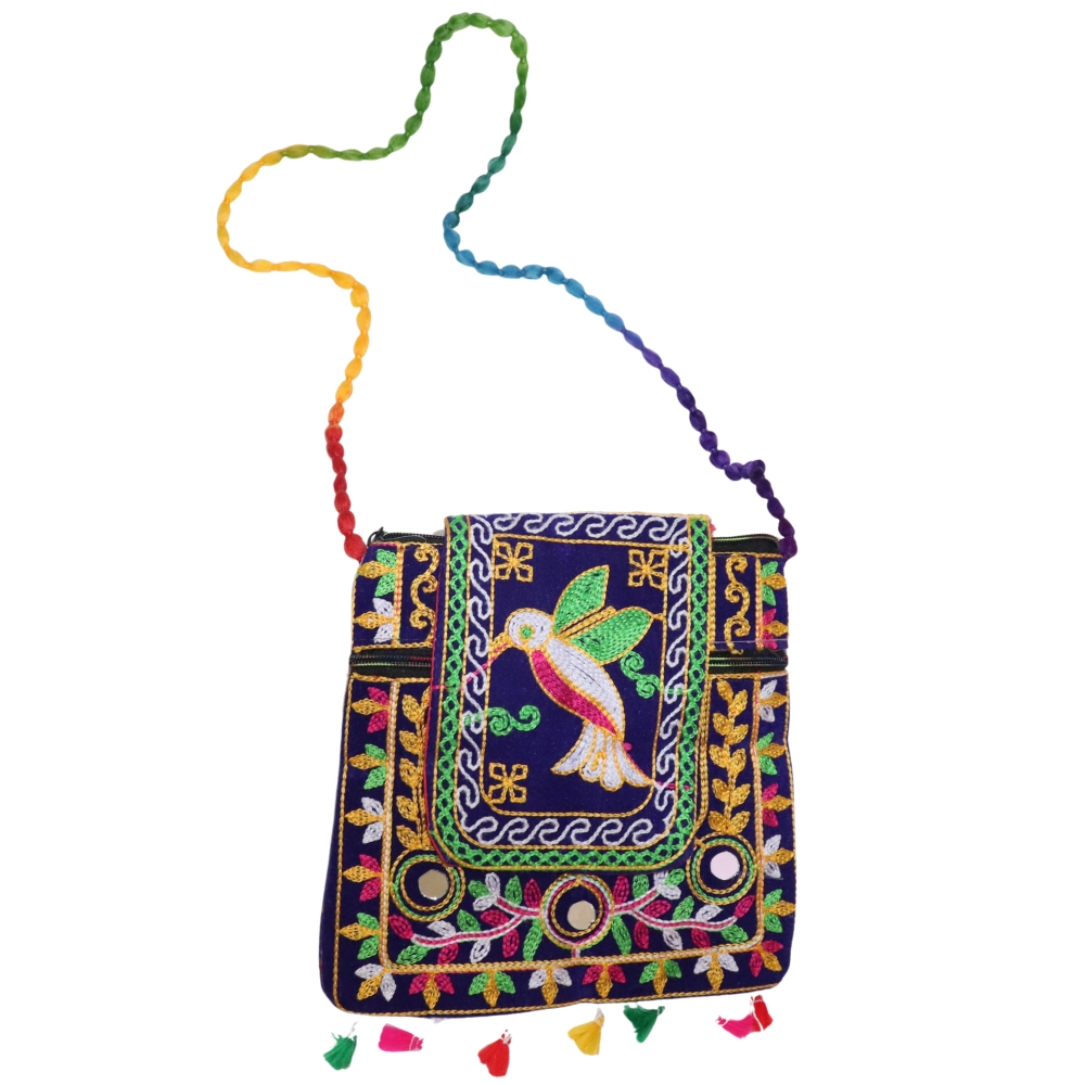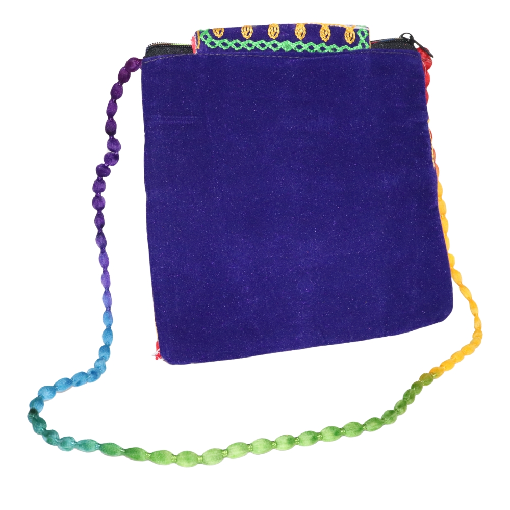 Add a regal touch to your ensemble with this elegant Jaipuri Handmade Velvet Sling Bag in a stunning royal blue hue. Expertly handcrafted by skilled artisans, this crossbody bag features traditional Rajasthani embroidery, intricate golden threadwork, and mirror embellishments that reflect the rich culture of Jaipur. The vibrant multicolor floral patterns, braided rainbow strap, and playful tassels enhance its festive appeal, making it ideal for ethnic wear, boho fashion, or cultural events. Made from soft yet durable velvet fabric, it includes a front zip pocket for convenience and a secure button flap closure for your essentials. Whether you're heading to a wedding, party, market stroll, or simply love artisanal accessories, this bag is a perfect blend of style and functionality. Lightweight and compact, it also makes a thoughtful gift for those who appreciate eco-friendly, handmade fashion. Step out in style with this timeless piece of Indian craftsmanship—crafted to carry heritage with grace.