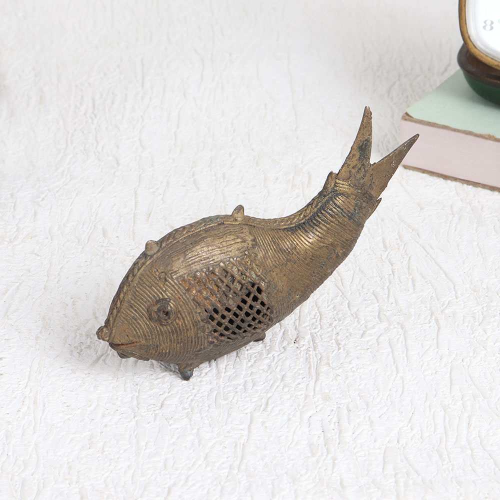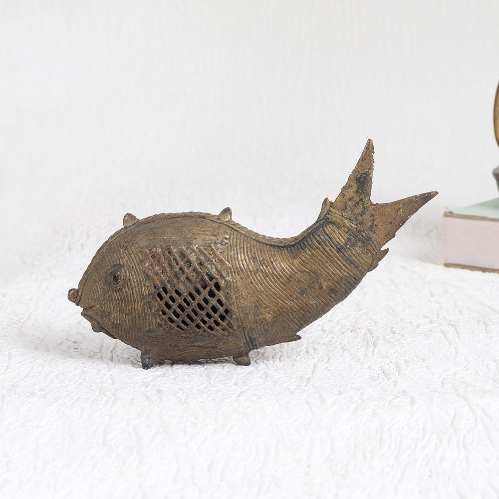 Enhance your interior with the timeless elegance of our brass fish statue that is adorned with intricate jali work and finished in a rich antique brown patina. Crafted by the deft hands of talented Indian artisans, this masterpiece is a testament to their artistry and dedication to preserving ancient craftsmanship traditions. The brass statue exudes an aura of antiquity, making it a versatile addition to various settings. Whether it's gracing the elegance of your home, the professionalism of your office, the ambiance of a restaurant, hotel, cafe, or the charm of a boutique shop, this fish statue is a statement piece that can seamlessly complement any environment. As a collector's item, it adds depth to your vintage collection and as an exhibition piece, it can captivate admirers with its intricate detailing. Furthermore, this splendid creation makes for a thoughtful and cherished gift for your family, friends or relatives on special, festive, or auspicious occasions.