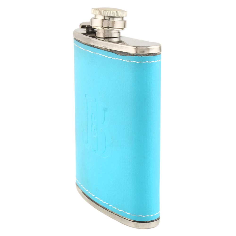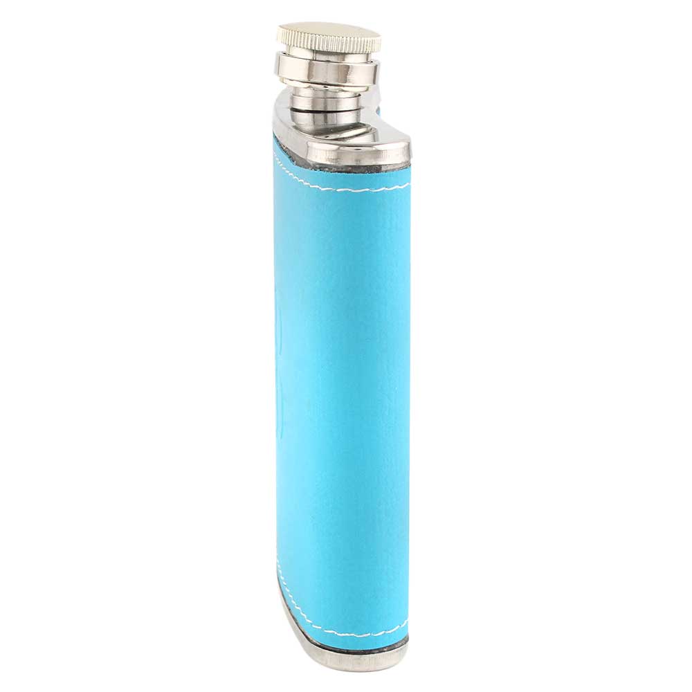 The stainless steel hip flask is encased in exquisite pale blue leather protecting your fingertips from the cold metal. The cap is easily added to the flask and fastens. The flask's shape is designed to fit your body shape, making it a practical addition to carry in your pocket.