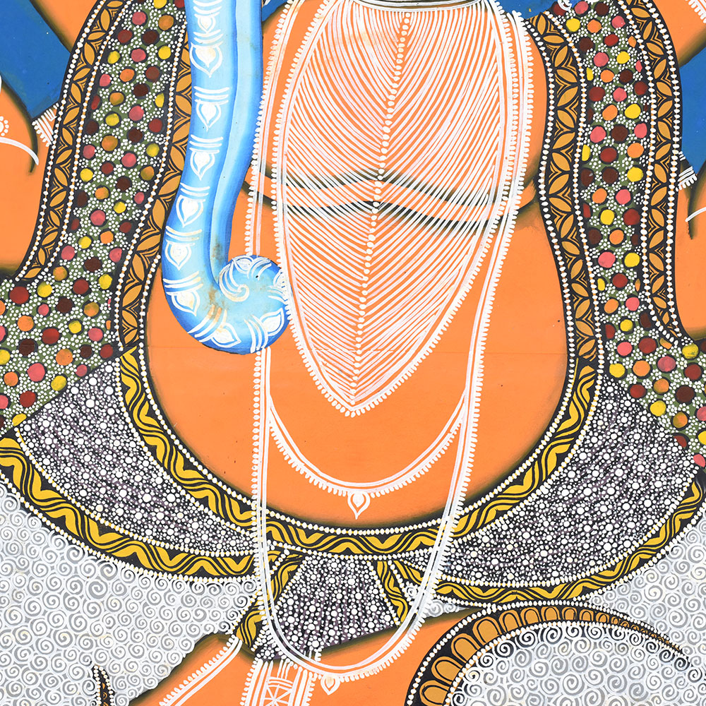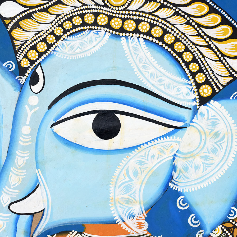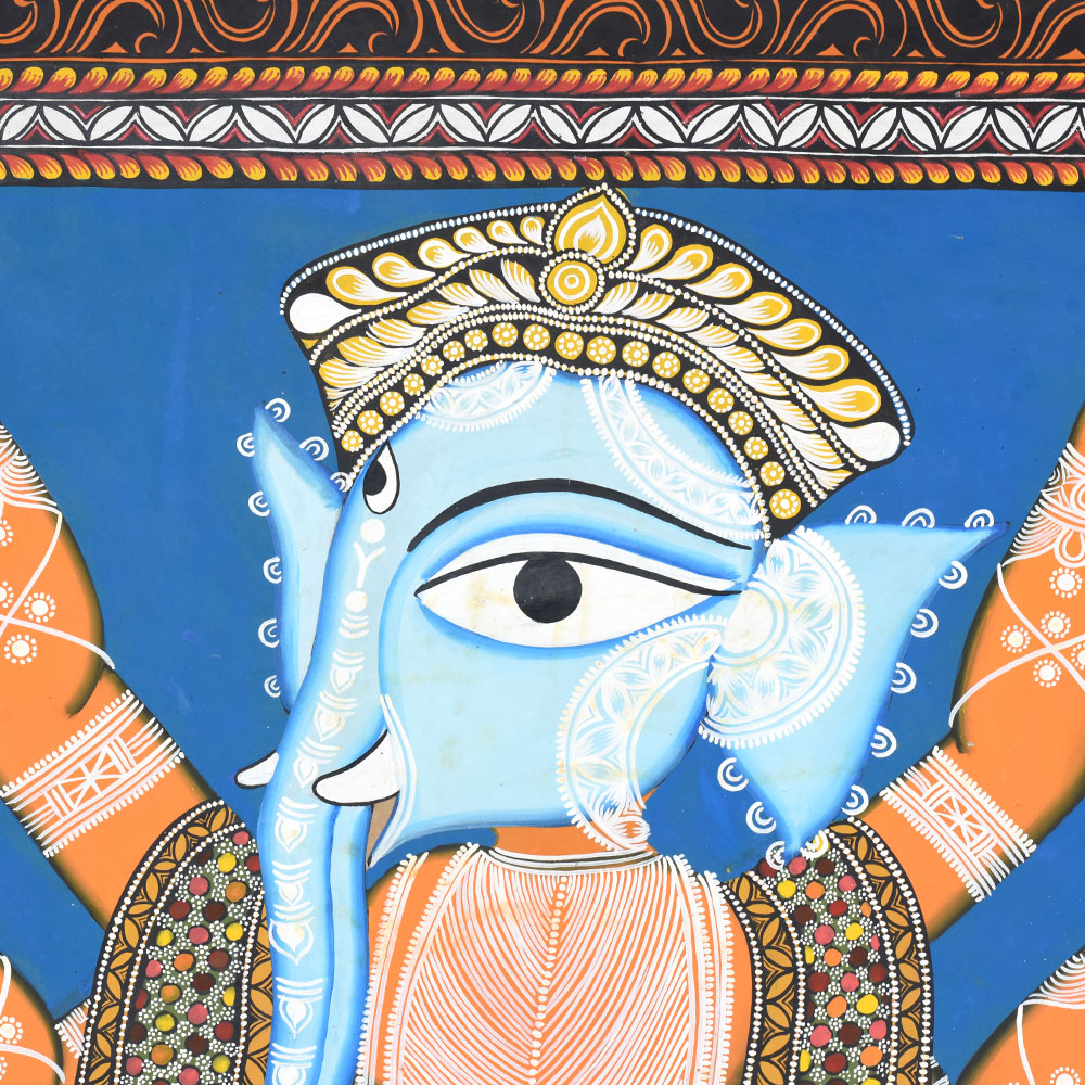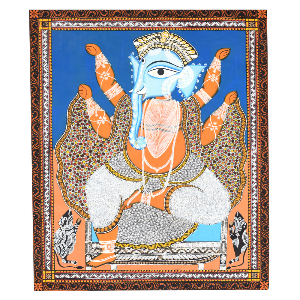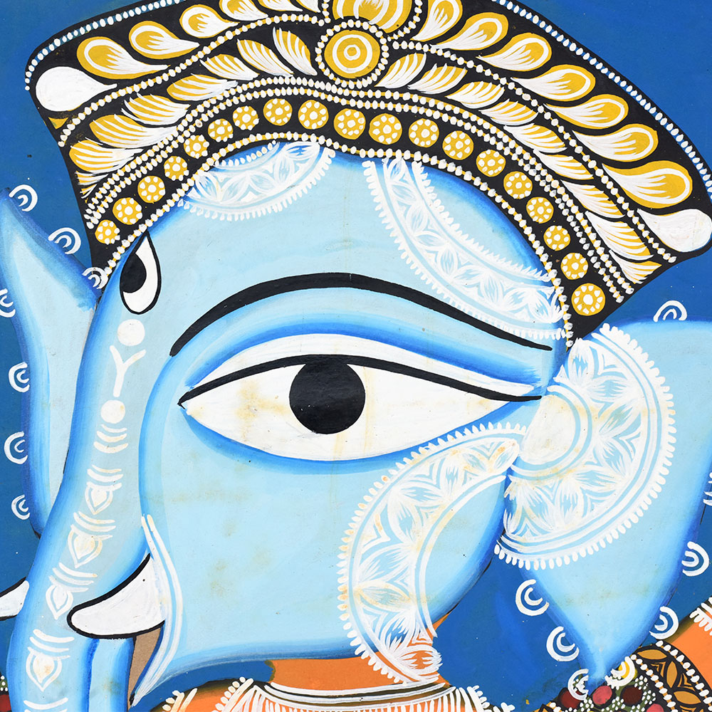 This striking artwork portrays Lord Ganesha in the traditional Kalighat Pattachitra painting style, a historic folk art form that developed around the Kalighat Temple in Kolkata. Created with bold outlines and vibrant colors, Kalighat Pattachitra paintings are known for their expressive figures, fluid brushwork, and powerful visual storytelling inspired by Hindu mythology and temple traditions.