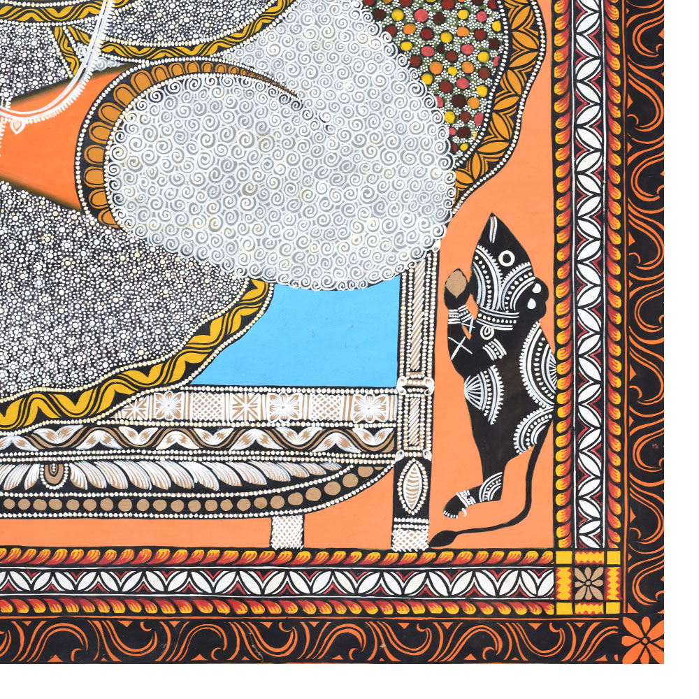 The artwork is framed with an elaborate ornamental border that enhances the traditional aesthetic of the piece. With a large size of 144 cm in height and 121 cm in width, this painting becomes a strong visual statement, making it ideal as a centerpiece in living rooms, art galleries, spiritual spaces, or heritage-inspired interiors.