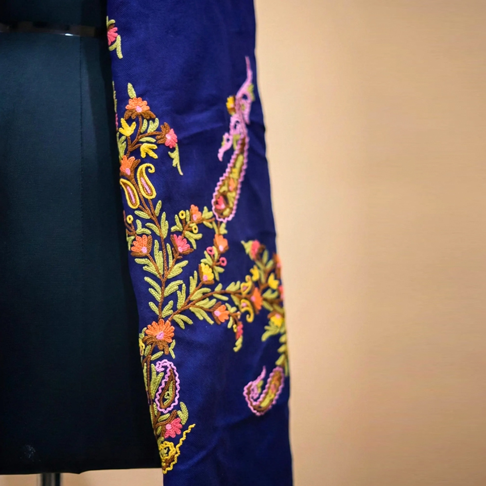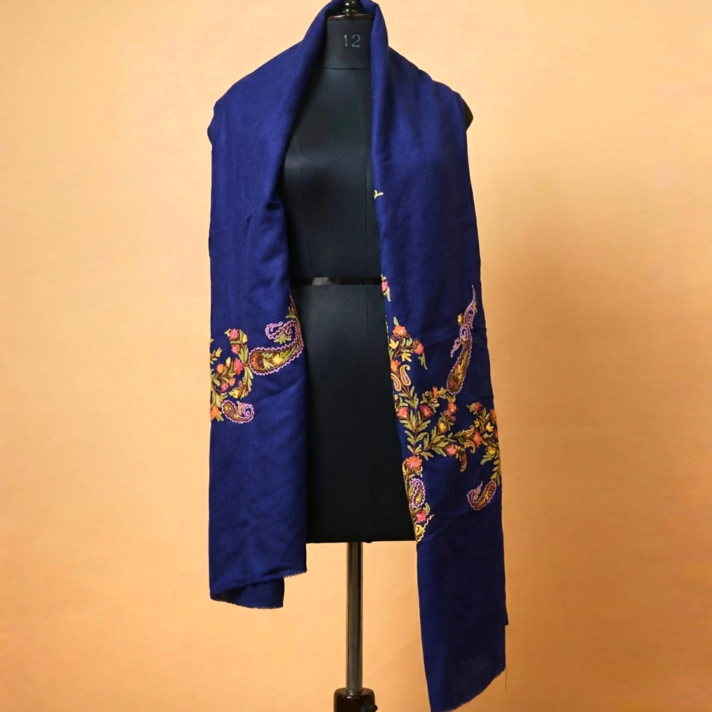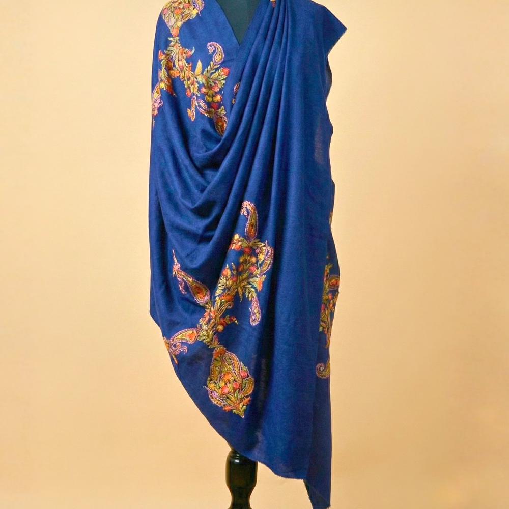 Wrap yourself in quiet luxury with this Kashmiri hand-embroidered blue shawl, crafted from a refined blend of wool and cashmere. The deep sapphire base is elevated with intricate floral and paisley embroidery, stitched patiently by skilled Kashmiri artisans. Soft to the touch yet richly detailed, this shawl drapes effortlessly, adding warmth and elegance to both everyday and occasion wear.