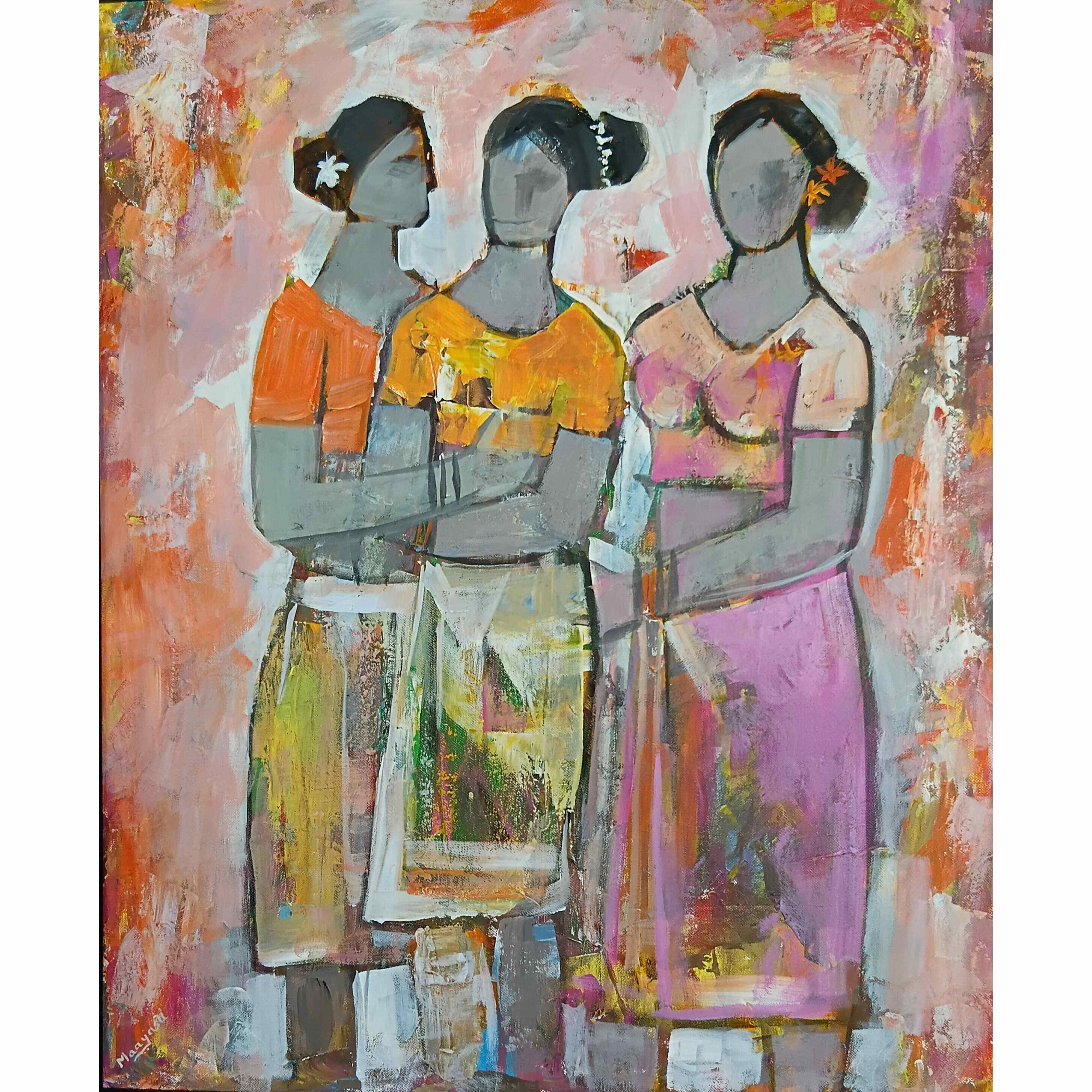 This captivating ethnic painting showcases a lively scene of three village women engaged in conversation at a bustling vegetable market in Kerala, India. Titled “Koottukar/Friends,” this artwork is crafted using acrylic colors on canvas with a unique knife technique, adding texture and depth to the composition. The piece is enriched with vibrant hues of purple, yellow, and orange, which evoke a sense of warmth and community. These colors not only enhance the market's cheerful atmosphere but also reflect Kerala's cultural vibrancy. This enchanting piece serves not just as a visual delight but also as an ideal wall décor choice for various settings, including homes, offices, shops, and restaurants, where it can infuse the space with a touch of artistry and cultural charm.