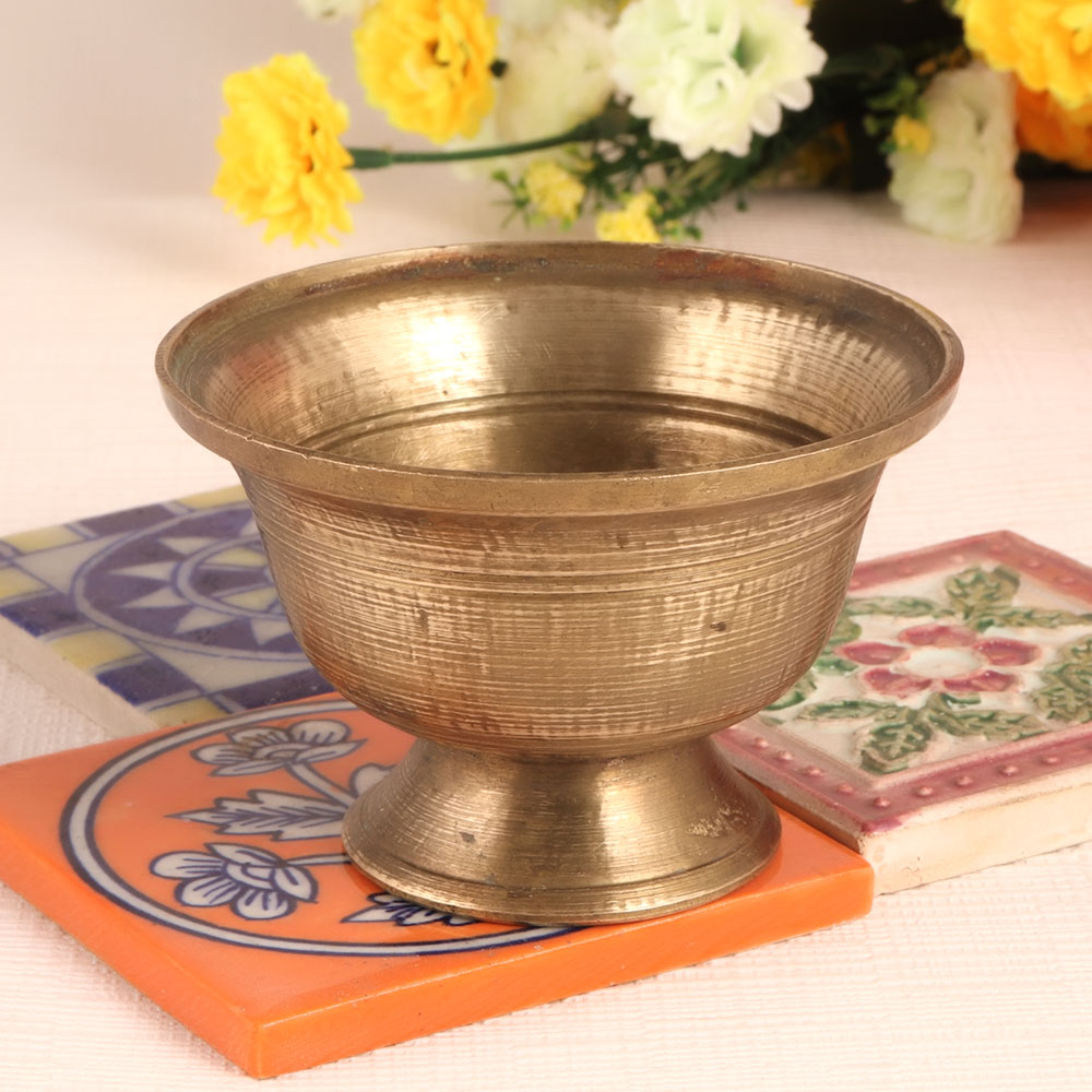 Beautify your interior with a small bowl made of high quality brass. It has a vintage style look and a stand at the bottom to keep it on the surface. This brass bowl is used in pooja, rituals, aarti, havan and auspicious events to keep kumkum tilak. Applying Kumkum Tilak on the forehead of the worshiper improves concentration and thinking ability. For centuries, the small brass bowls have been used in Indian households to beautify the interior. Their amazing design sets them apart from other bowls and makes them a perfect gift for birthday, wedding, anniversary, housewarming, festival, corporate party and auspicious functions for your loved ones.