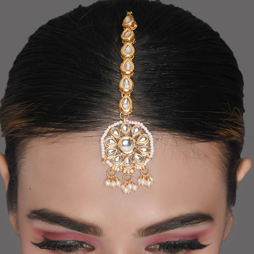 Elegant, traditional, and exquisitely handcrafted, this kundan pearl maang tikka is designed to enhance bridal and festive looks with timeless Indian artistry. Featuring a floral kundan motif bordered with fine pearl beading and finished with delicate pearl drops, it adds a graceful focal point to the forehead. Kundan Maang Tikka Highlights This maang tikka blends classic kundan craftsmanship with soft pearl accents, making it an essential accessory for traditional occasions. Floral kundan design with reflective stone detailing Fine pearl beading and dangling pearl drops for elegant movement Lightweight construction for comfortable wear Handcrafted by skilled artisans using traditional techniques Perfect for weddings, receptions, festivals, and cultural celebrations Specs & Materials Material: Metal alloy with kundan stones and pearl beads Colour: Warm gold tone with white pearls Design: Statement maang tikka with floral centre and drop detailing Origin: Handmade in India and carefully quality-checked Each piece may show slight variations due to handcrafted artistry Includes chain with hook for secure placement Styling & Gift Inspiration Ideal for bridal lehengas, sarees, and traditional ensembles Complements kundan earrings, necklaces, and full bridal sets A beautiful gift for brides, weddings, and festive occasions Adds a regal and balanced look to centre-parted hairstyles Care Guide Store the maang tikka in a dry pouch and avoid contact with water, perfume, or harsh chemicals. Gently wipe with a soft cloth after use to maintain shine and stone clarity. Artisan Craftsmanship Each maang tikka is meticulously handcrafted by artisans. All jewellery is handmade never machine-made ensuring uniqueness, heritage value, and timeless beauty.