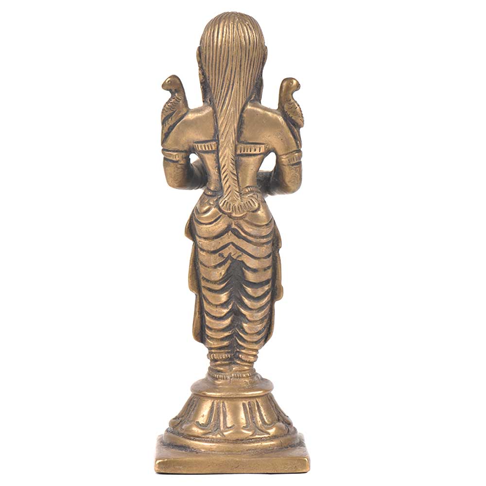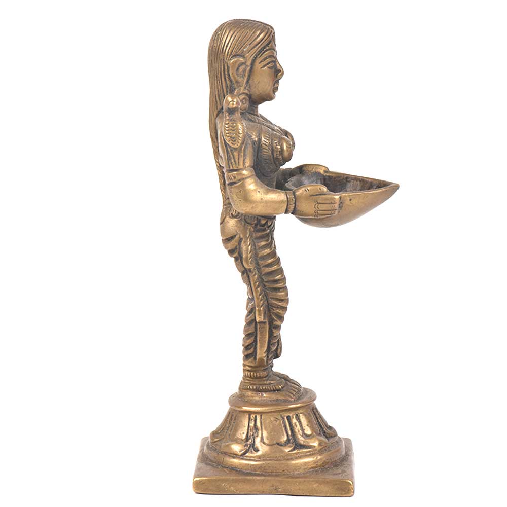 The lady is on a raised platform holding a diya in her hands and this figurine is made of bronze and is handmade by the skilled craftsmen of India. This diya oil lamp lady is beautifully and very finely engraved and has 2 birds sitting on her shoulder and can be used for gifting, decoration during the festive season.