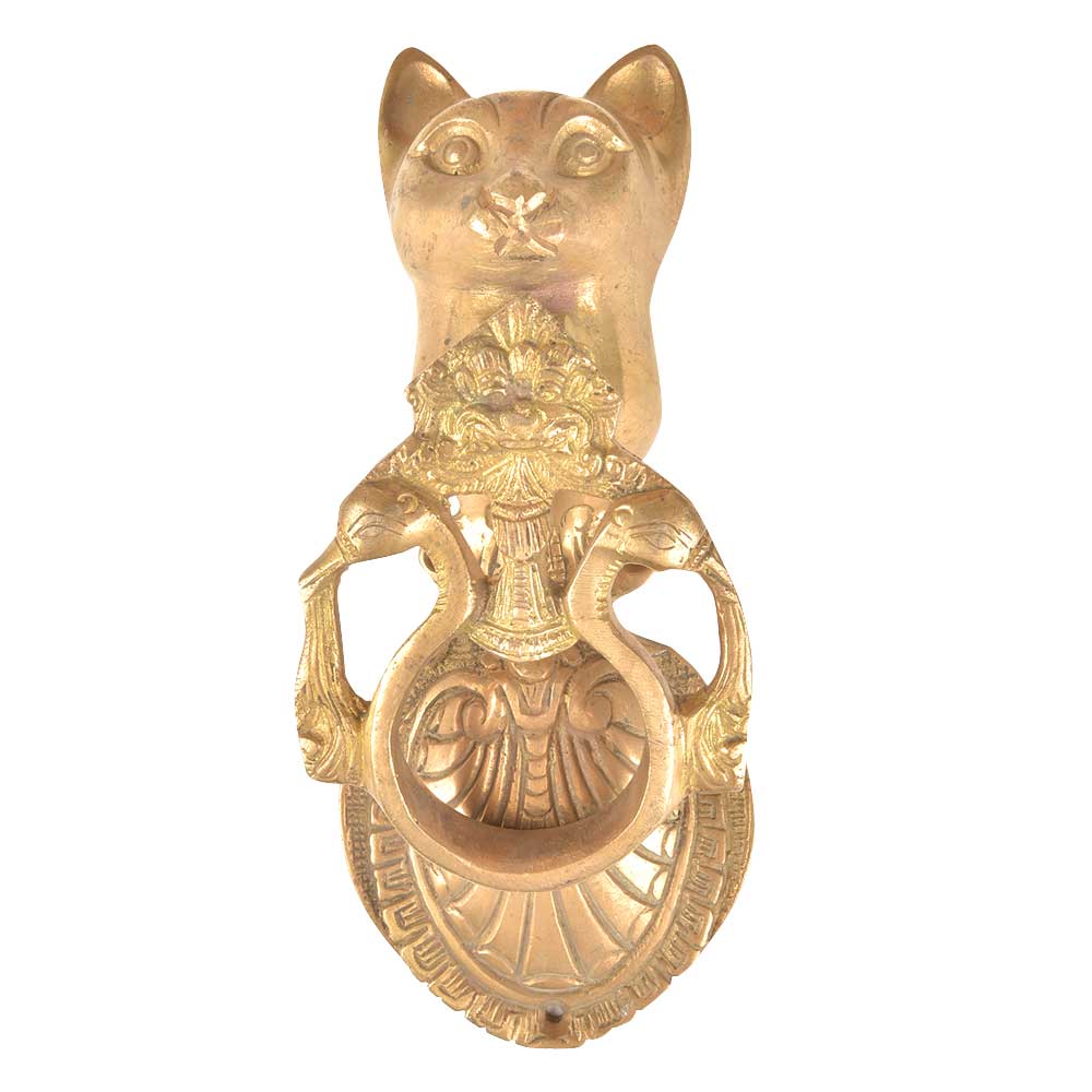 A beautiful looking door knocker that has a cat face on top of the peacock on both the ends of the knocker. It is a rather heavy and solid knocker that gives your main door a royal look. The lovely knocker ring rests on a heavy brass plate that is engraved. The ring then produces a knock when it is struck on the plate.A beautiful gift for your family and friends.