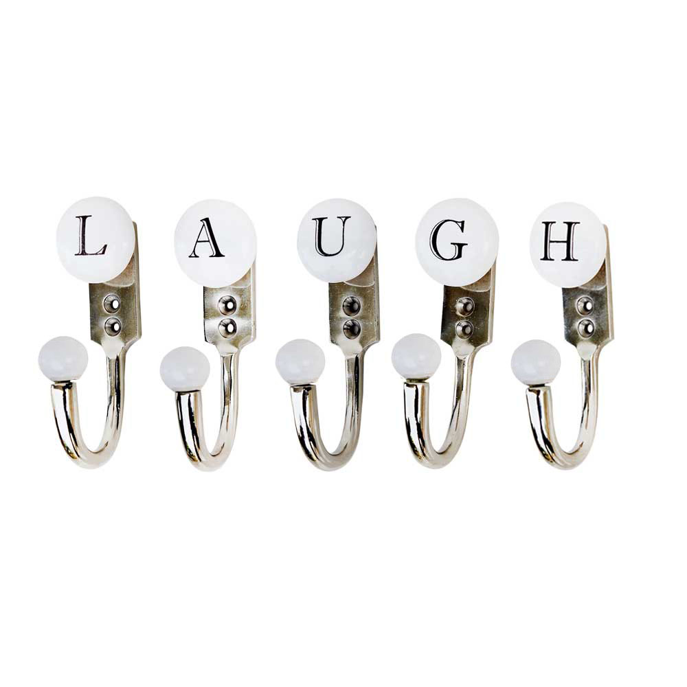 LAUGH white and black alphabet hooks (combo pack). When put on wall or cabinet it is an art in itself. This hook is strong enough to hold your keys, tea cups, hand towels, cloths etc.