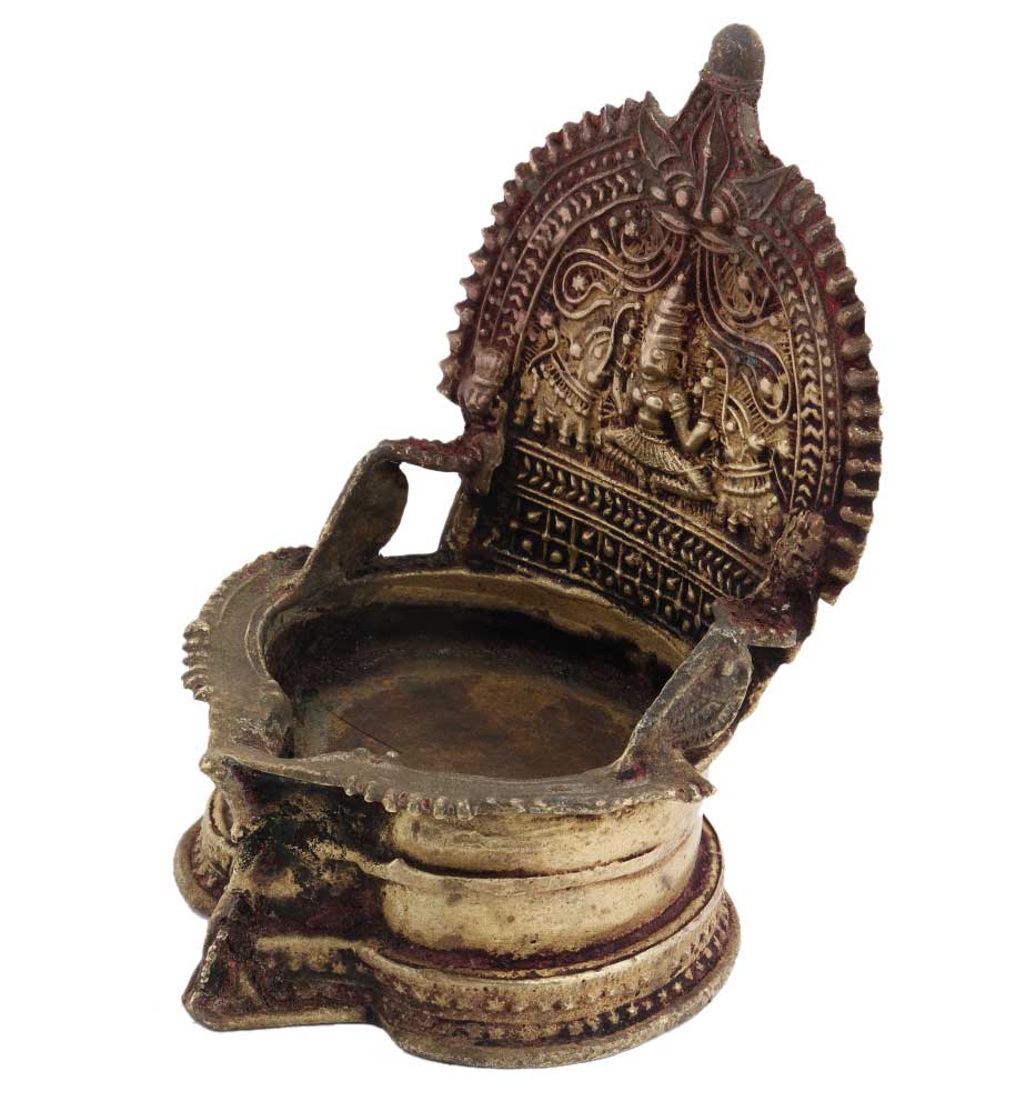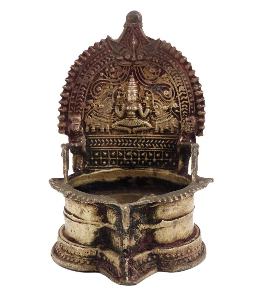Brass Oil Lamp with intricate designs and goddess laxmi and two jumbo elephants on her either side. Crafts with perfection this golden brass oil lamp is a perfect gift for special occasions.
