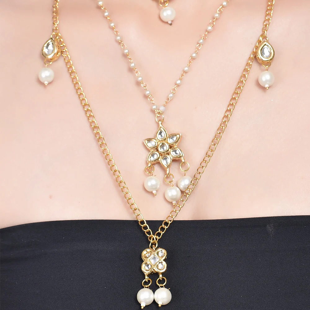 The Layered Pearl Mirror Star Necklace Set for Elegant Evenings is designed to bring subtle brilliance to refined occasions. Crafted in polished golden brass, the necklace showcases a radiant mirror star centerpiece complemented by delicate pearl accents. The layered chain arrangement creates soft dimension along the neckline while maintaining a lightweight and graceful feel. Perfect for evening gatherings and festive events, this handcrafted piece blends classic elegance with modern charm.