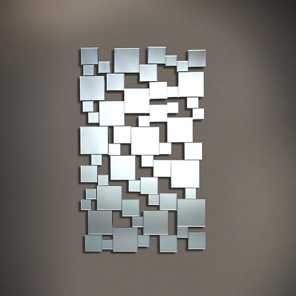Its layered square mosaic design creates a sculptural, architectural effect that goes beyond a standard flat mirror.