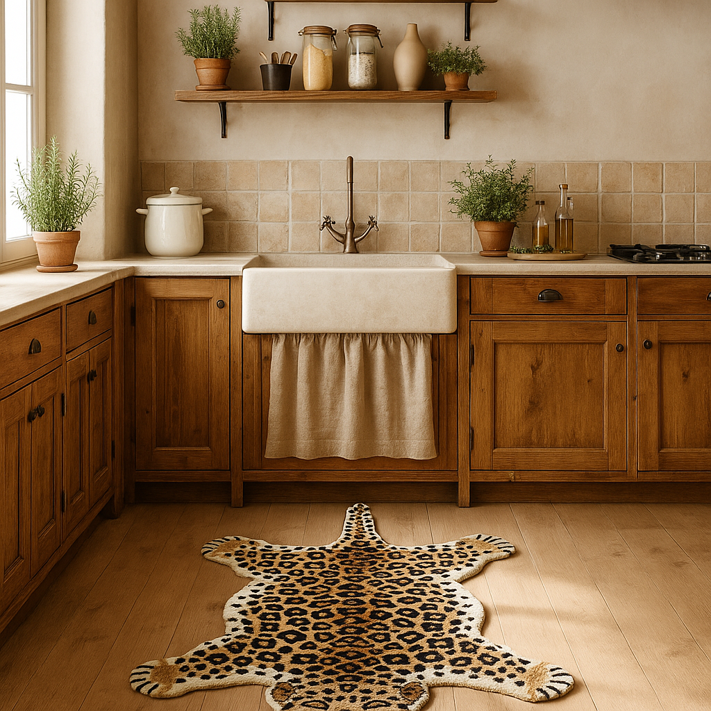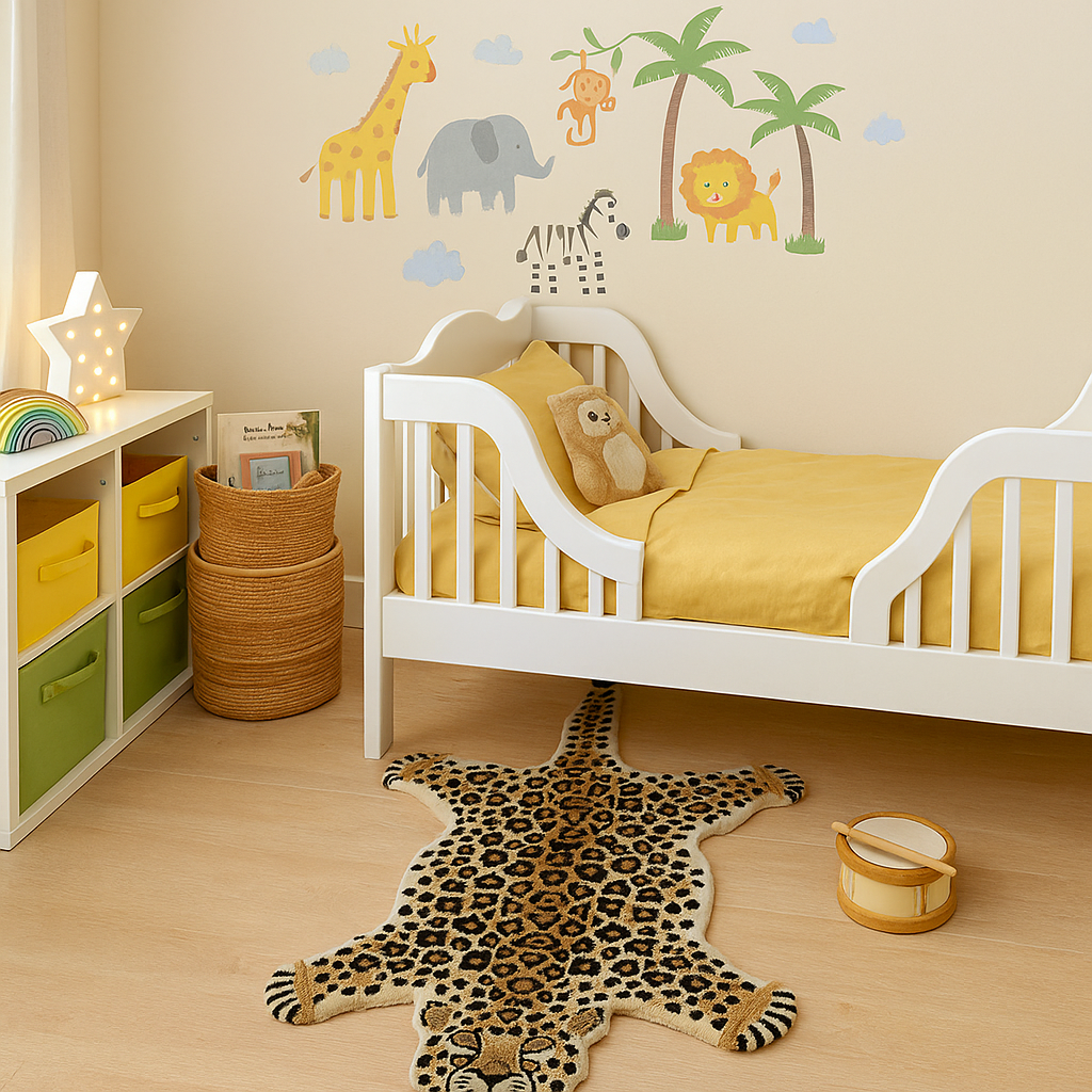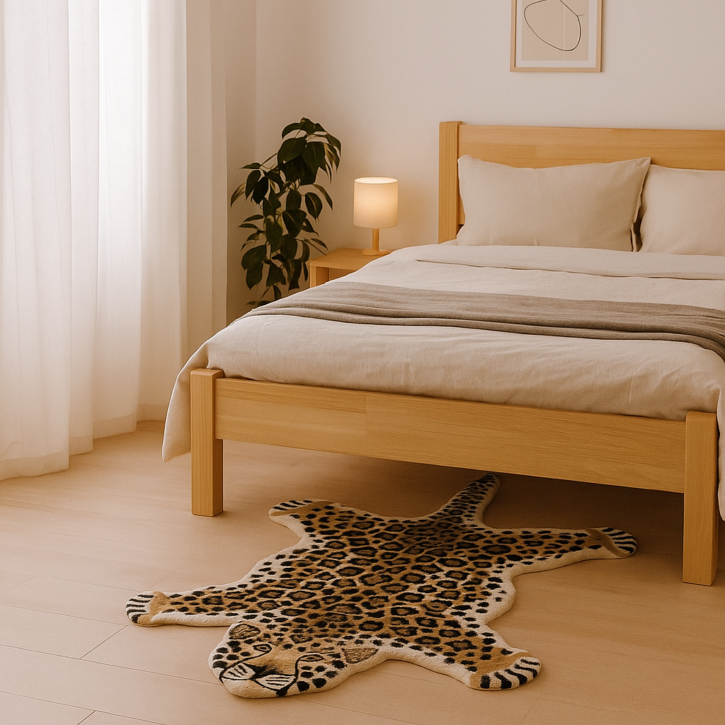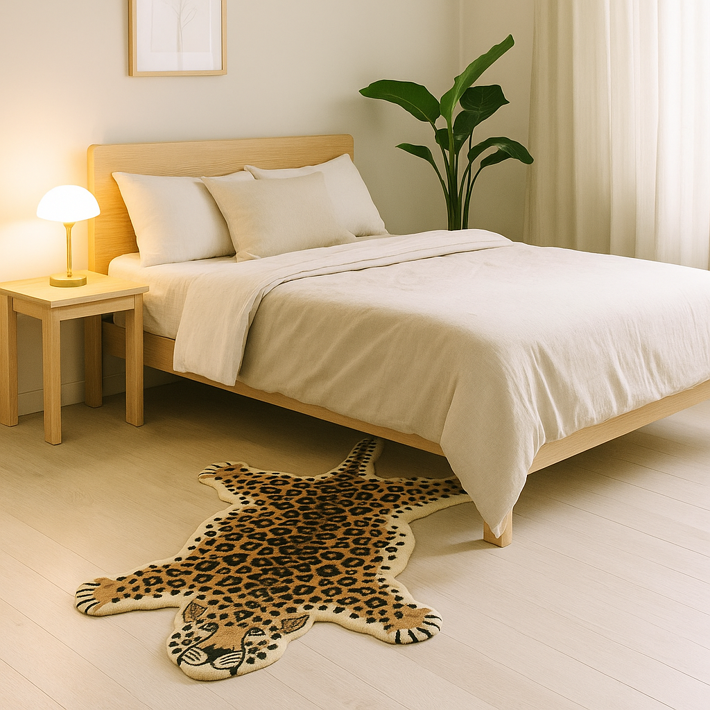 A realistic looking little cheetah lying flat on its back in your space sounds like something your visitors will remember. You can't go wrong with this purchase. The snout is flawless, the paws are of realistic proportions, and the hide is unmistakably cheetah. Take note of how the spine runs the length of its back, all the way down to the straightened tail. This Leopard rug is hand-tufted from dyed woolen yarn. Created and developed in a small workshop; skilled artisans ensure the highest quality. Each detail, stripe, and dot is added with extreme care. Add a charming animal rug to your living space.