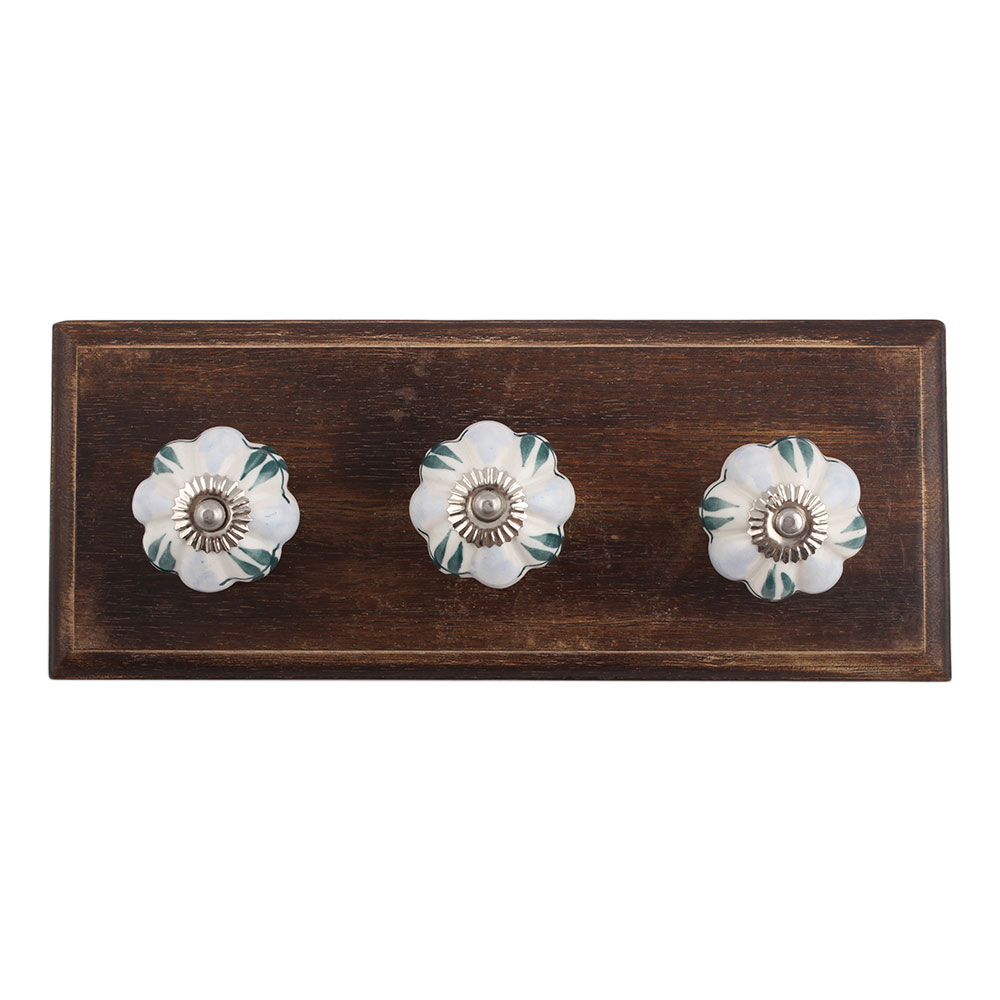 Light Blue Ceramic Wooden Hook. A Perfect Complement to the Soft Tone of the Wood are these White Traditional Hat & Coat Hook Made of Genuine Porcelain and Brass. It can be use to Hang Jewellery, Leashes, Towels, Scarves, Light Weight Sweaters, Caps Etc.