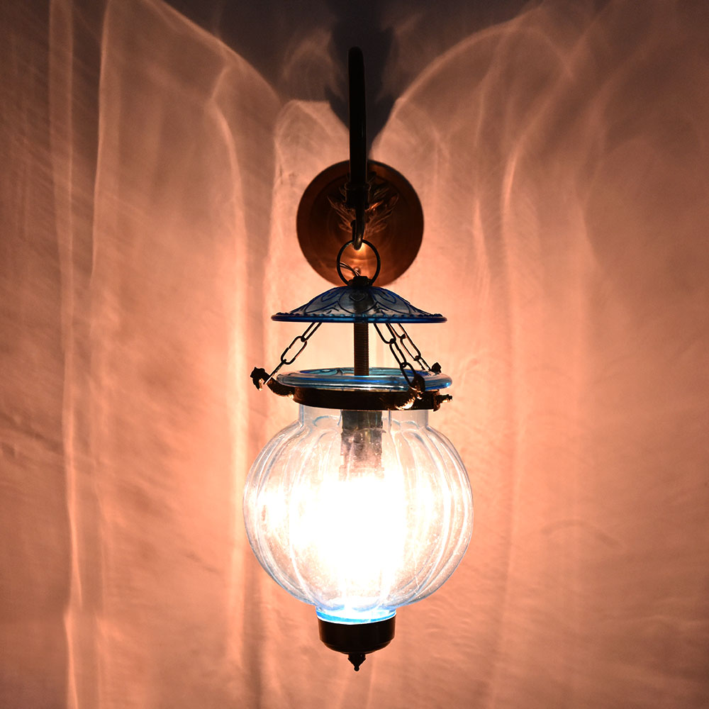 Light blue melon shaped glass hanging lamp in leafy bronze bracket. The lamp is unique and allows a great lighting option for any room.