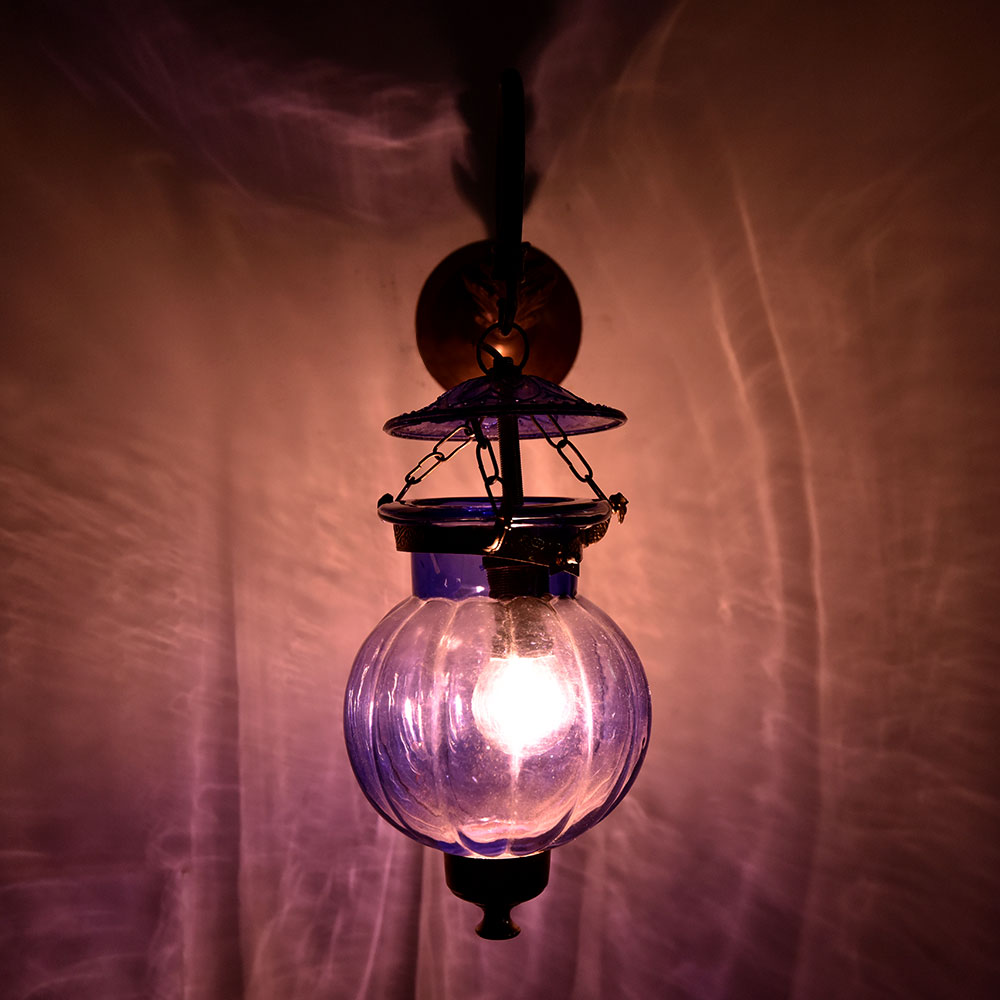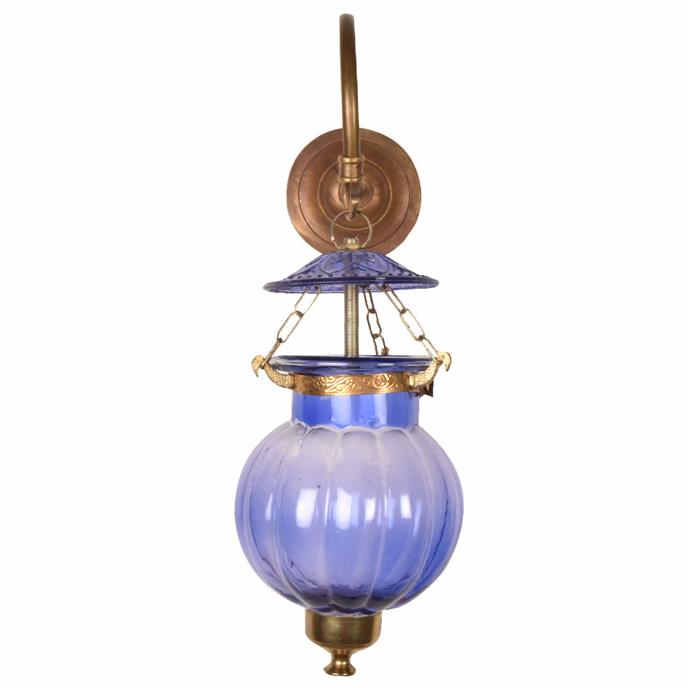 Light blue pumpkin shaped glass hanging lamp on bronze bracket. The lamp is unique and allows a great lighting option for any room.