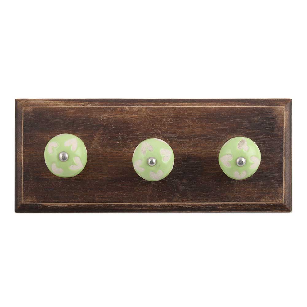 Light Green Etched Ceramic Wooden Hook. A Perfect Complement to the Soft Tone of the Wood are these White Traditional Hat & Coat Hook Made of Genuine Porcelain and Brass. It can be use to Hang Jewellery, Leashes, Towels, Scarves, Light Weight Sweaters, Caps Etc.