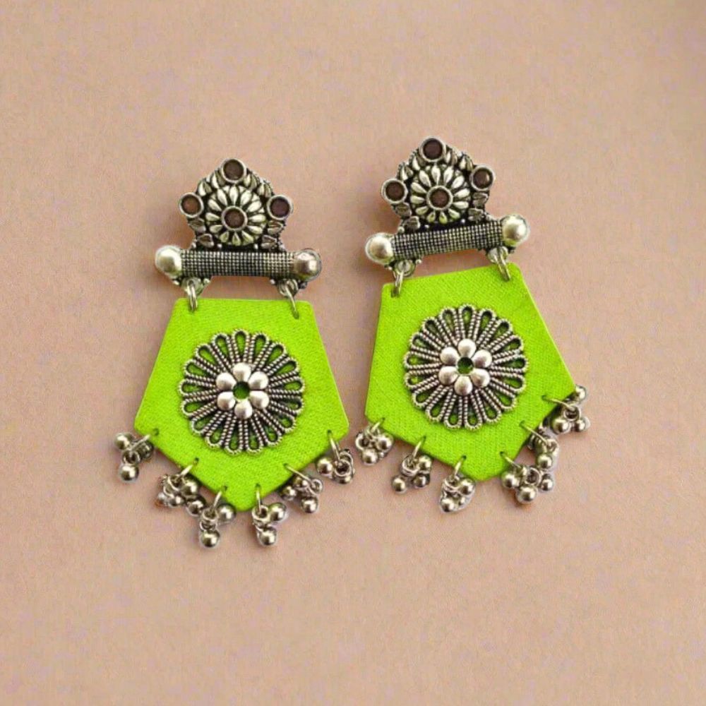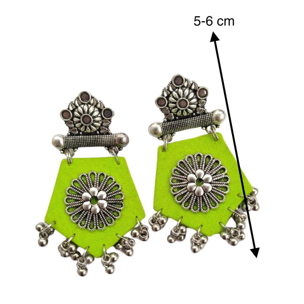 These Light Green Fabric Jhumka Earrings with Silver Details bring together soothing color and traditional Indian form in a beautifully balanced design. The gentle light green fabric base evokes freshness and calm, while silver-toned accents add a subtle festive shimmer. Crafted to feel airy yet expressive, the jhumka silhouette moves gracefully, enhancing your look without overwhelming it. Ideal for both everyday ethnic wear and celebratory moments, they reflect understated craftsmanship and timeless appeal.