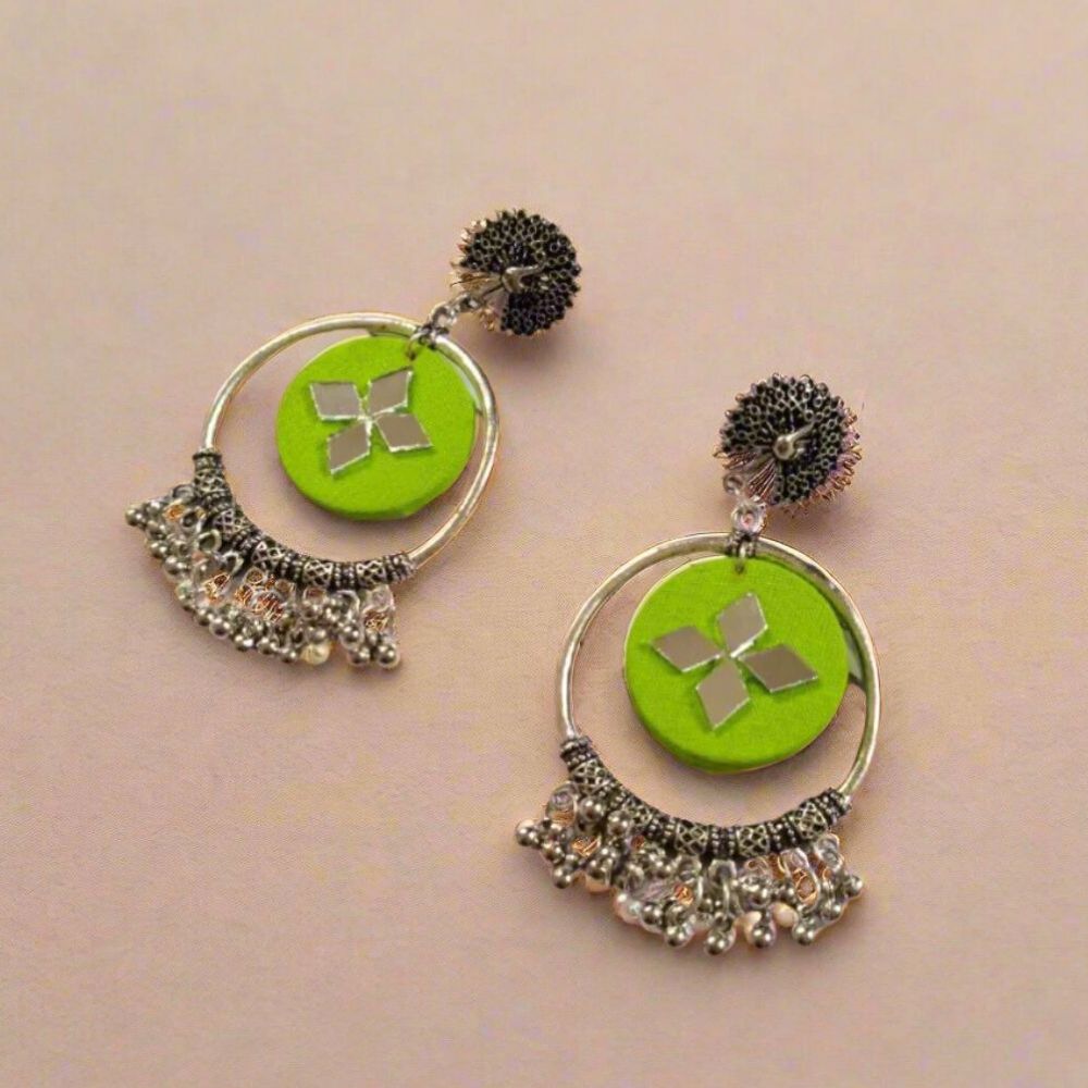 The Light Green Oxidized Jhumka Bali Earrings offer a refreshing take on a timeless Indian jewellery silhouette. Crafted on a fabric base, the gentle light green tone brings calm elegance, beautifully balanced by oxidized detailing that adds vintage depth. The Bali hoop paired with a traditional jhumka creates graceful movement without heaviness. Designed for comfort and cultural charm, these earrings blend everyday wearability with festive appeal.
