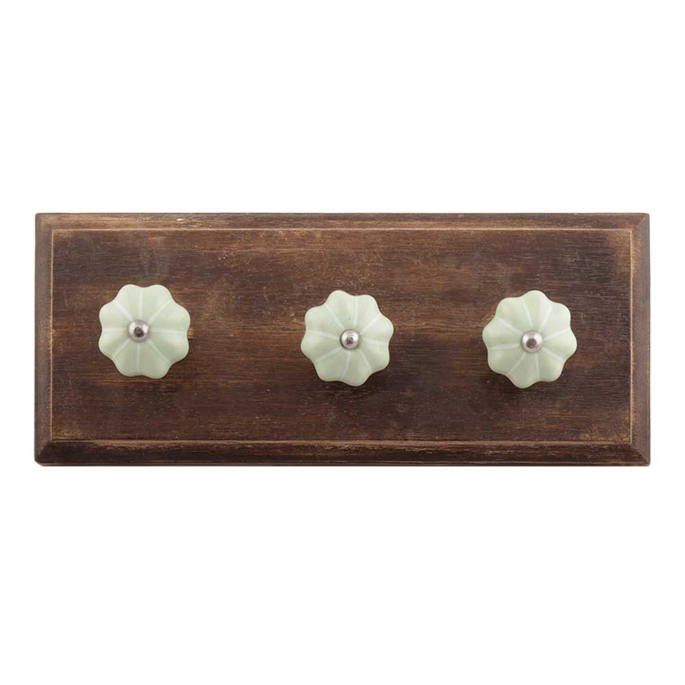 Light Green With Silver Line Medium Ceramic Melon Wooden Hook. A Perfect Complement to the Soft Tone of the Wood are these White Traditional Hat and Coat Hook Made of Genuine Porcelain and Brass. It can be used to Hang Jewelry, Leashes, Towels, Scarves, Light Weight Sweaters, Caps etc.