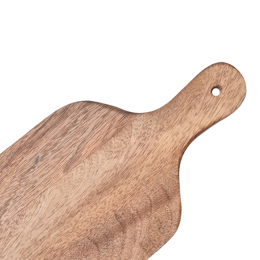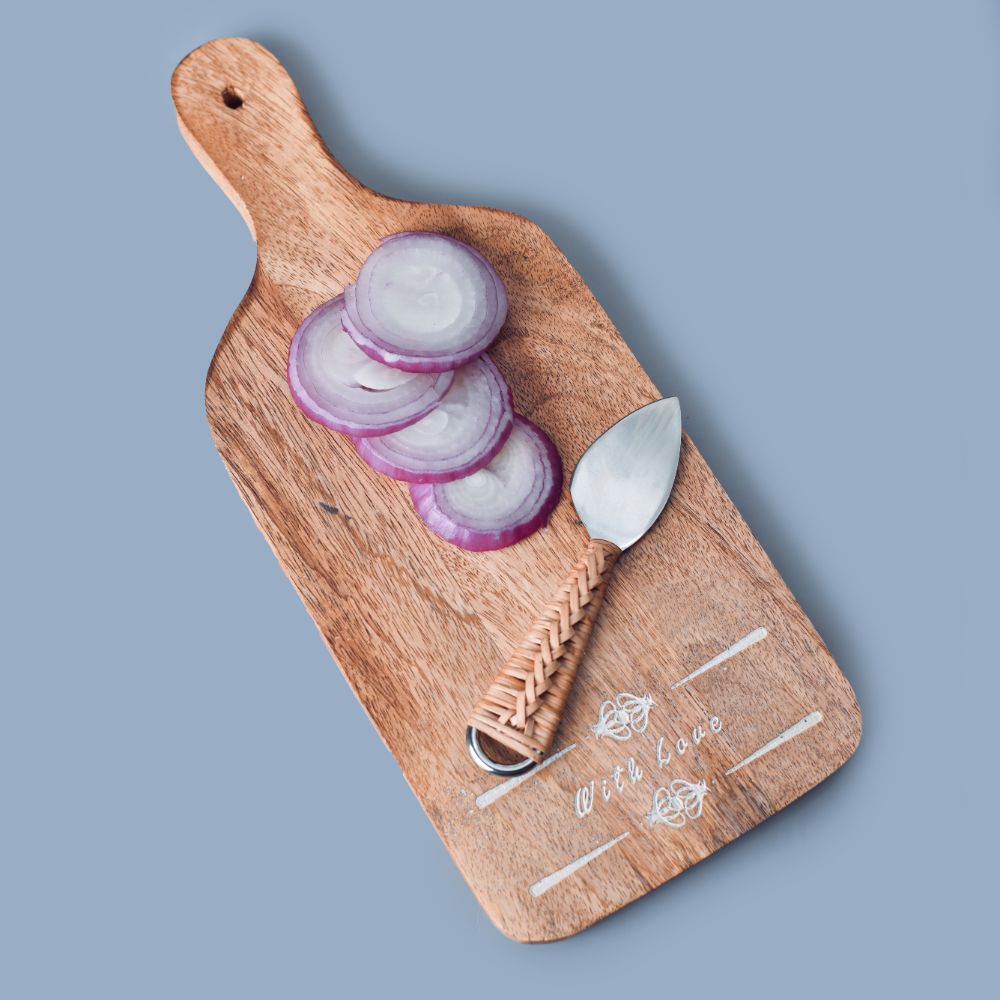 The handmade wooden cutting board is the most environmentally friendly chopping board with a comfortable handle for better grip while cutting or serving. This wood-cutting board can withstand dampness, which provides longevity and helps it keep its form. It is portable and easy to clean. This wooden cutting board is resistant to being scratched by sharp blades. It is bacterial-proof and secure to use. It is perfect for many tasks, including dicing, chopping, and slicing cheese, fruits, and vegetables. It is manageable and light enough to serve as a serving board. It is simple to store or display in the kitchen due to its compact form. It has a lovely handle that makes it easier to hold.