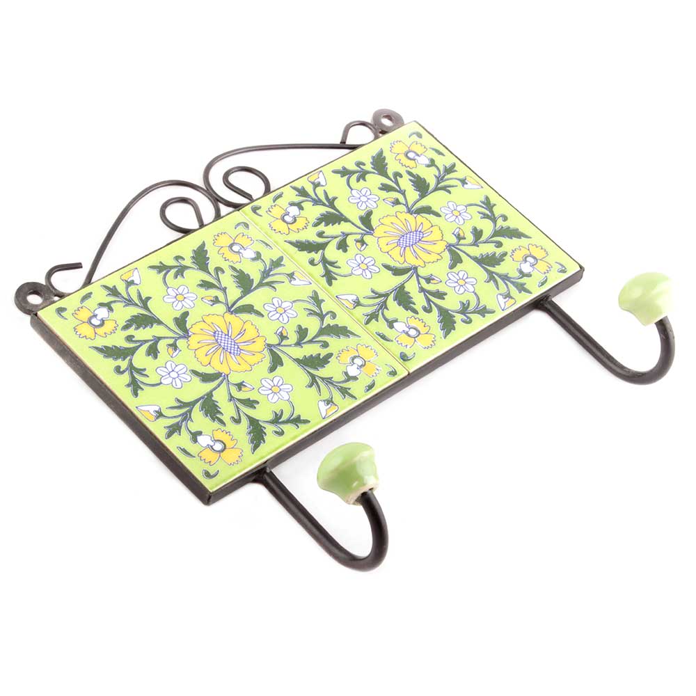 Lime Green Ceramic Floral Tiles Hooks. When Put on Wall or Cabinet It is An Art in Itself. The Metal Part of this Hook is Black Powder Coated.