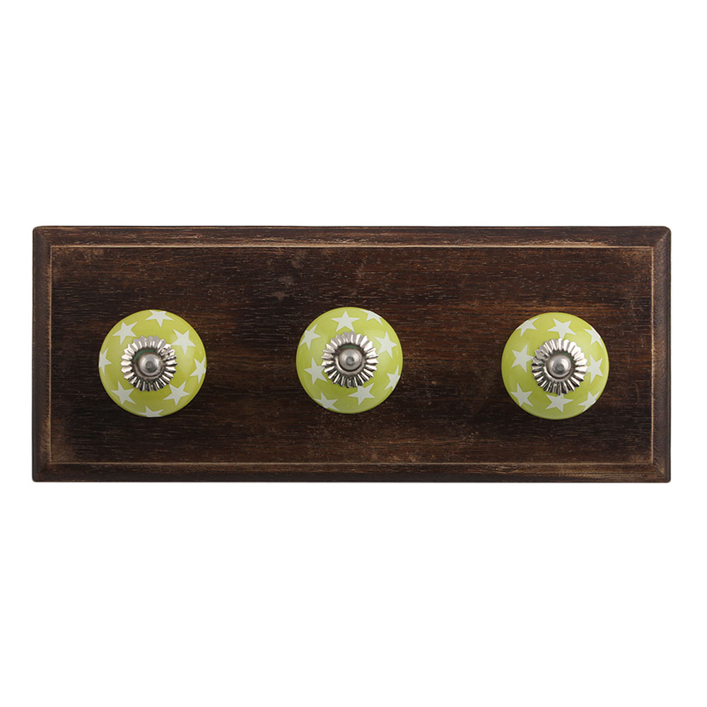 Lime Green Star Ceramic Wooden Hook. A Perfect Complement to the Soft Tone of the Wood are these White Traditional Hat & Coat Hook Made of Genuine Porcelain and Brass. It can be use to Hang Jewellery, Leashes, Towels, Scarves, Light Weight Sweaters, Caps Etc.