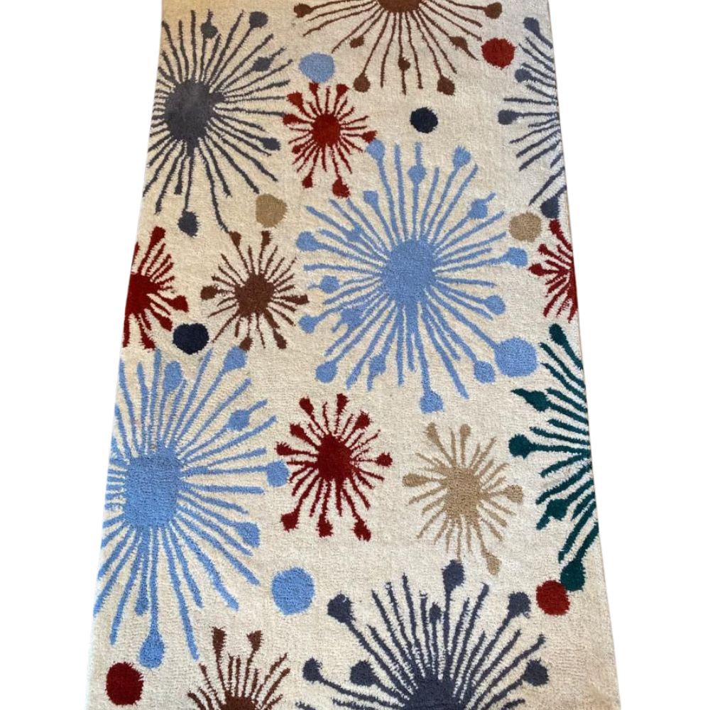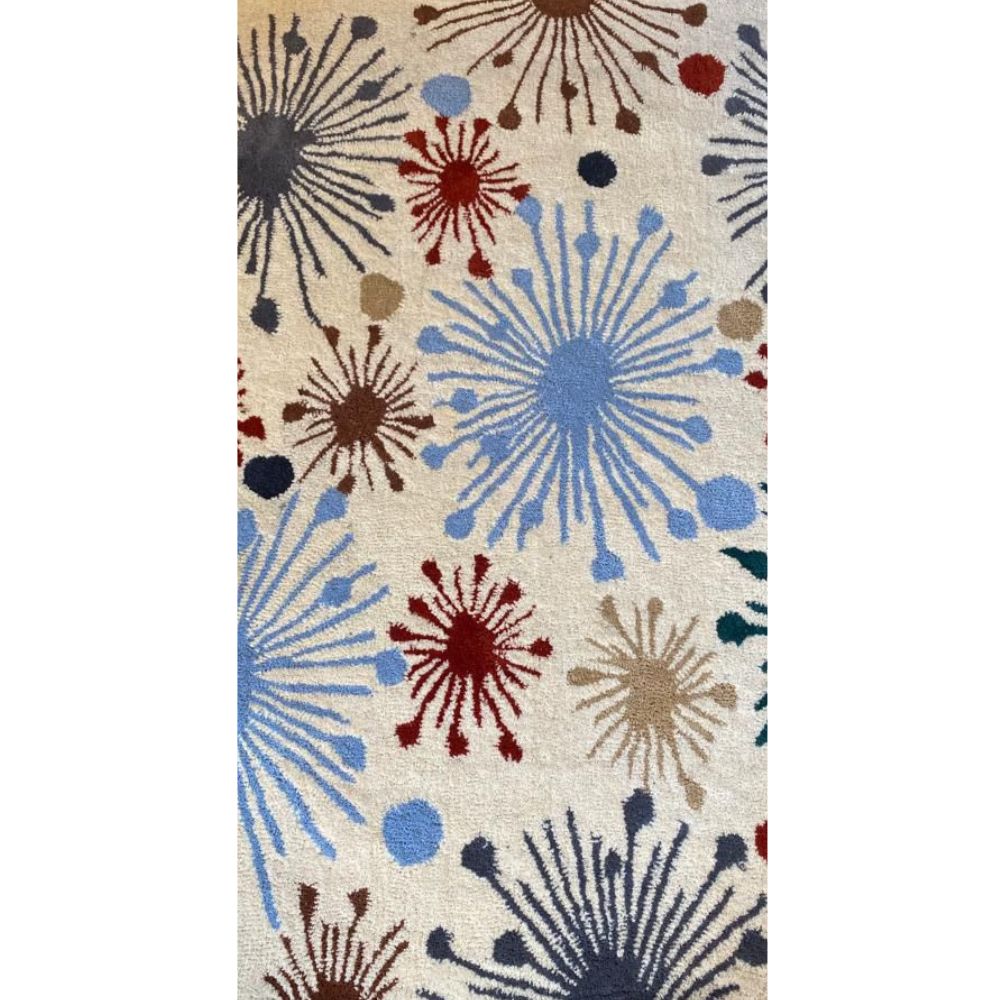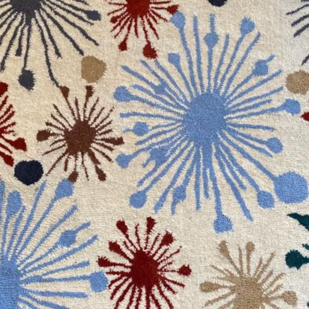 This hand-tufted wool rug features a bold and energetic starburst-inspired design, bringing a sense of movement and modern artistry into your home. Crafted with 100% natural wool and finished with a durable cotton backing, this rug balances luxury, comfort, and durability. The lively bursts of color across a neutral base make it a striking statement piece suitable for living rooms, bedrooms, offices, or creative studio spaces. Color Palette: Ivory/Beige Base: Soft and neutral background that allows the colorful motifs to stand out. Sky Blue: Calming and cool, forming large starburst patterns for a refreshing touch. Deep Red / Rust: Warm, vibrant accents that add bold energy and depth. Charcoal Grey: Grounding contrast that balances the brighter tones. Earthy Brown / Taupe: Neutral highlights for a natural, grounded aesthetic. Emerald Green: Fresh, nature-inspired pop that adds harmony and balance. This multi-color palette makes the rug versatile it complements both modern minimalist interiors and eclectic, colorful homes. Design & Pattern: Inspired by starbursts or fireworks, with radiating lines forming circular motifs in multiple sizes. Each color burst is carefully hand-tufted, creating a.