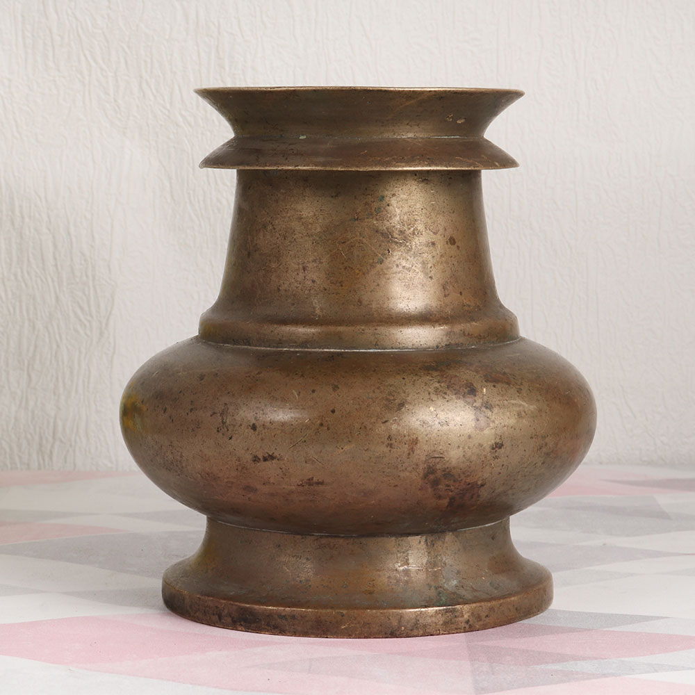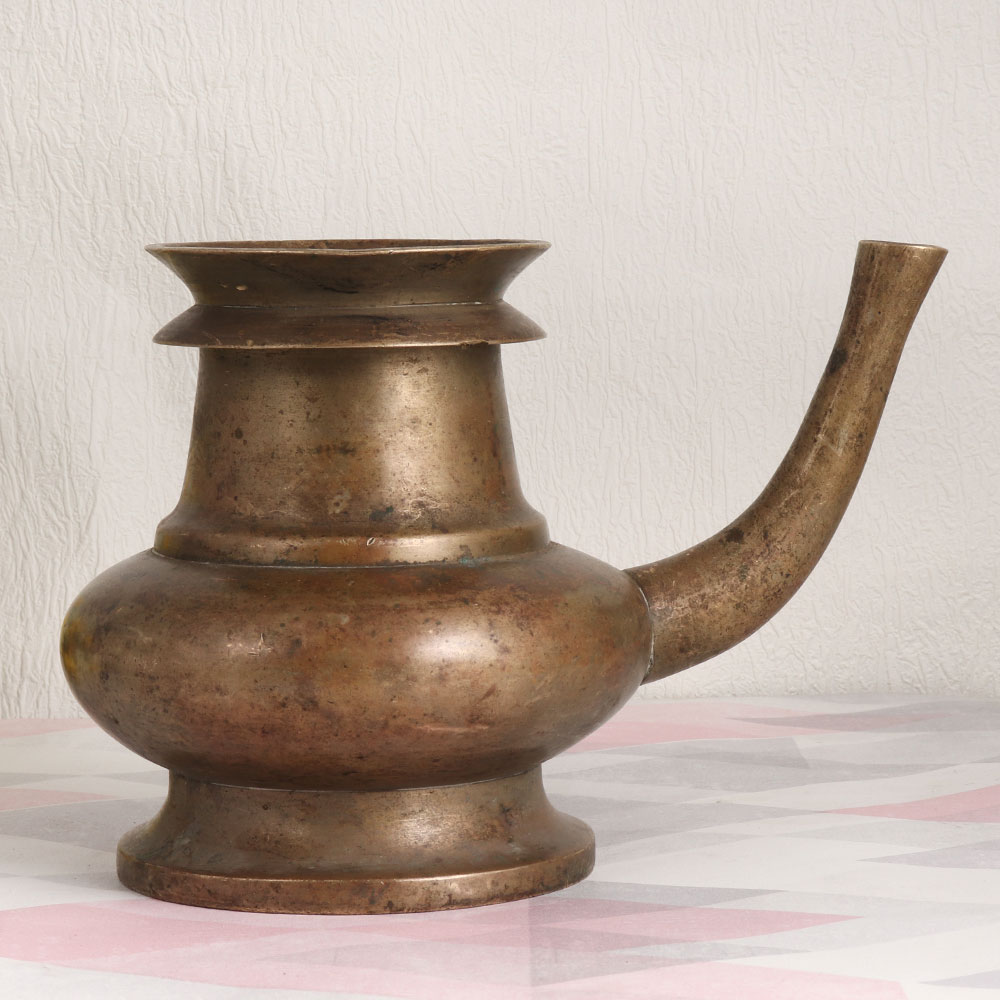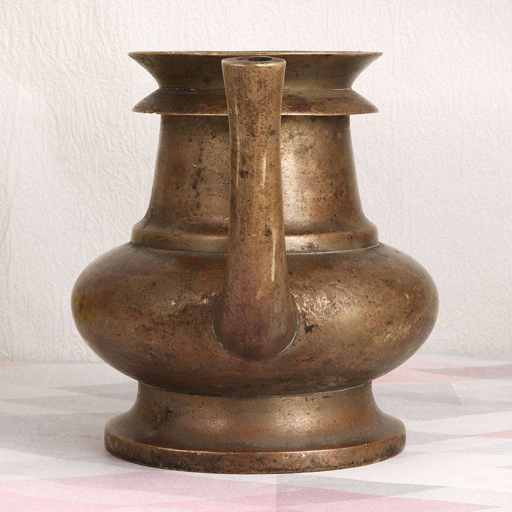 This Vintage Brass Holy Water Pot is crafted by highly skilled and experienced Indian artisans in the timeless tradition of South Indian Art. Made from high-quality brass, this ornate piece showcases an antique brown finish that exudes an air of vintage elegance, making it a versatile addition to your home, office, restaurant, hotel, cafe, or shop. This holy water pot is not just a captivating decor piece but also a symbol of spirituality. It serves a dual purpose, acting as an indoor flower pot while also being a vessel of great significance during havans, rituals, and auspicious occasions. Devotees can partake in the sacred tradition of receiving holy water from this magnificent piece, enhancing the spiritual ambiance of any setting. Additionally, it makes for an exquisite addition to any vintage collection, capturing the essence of Indian artistry. A meaningful gift, it can be shared with your family, friends or relatives on special, festive, or auspicious occasions, bringing a touch of divine grace and aesthetic charm into their lives.