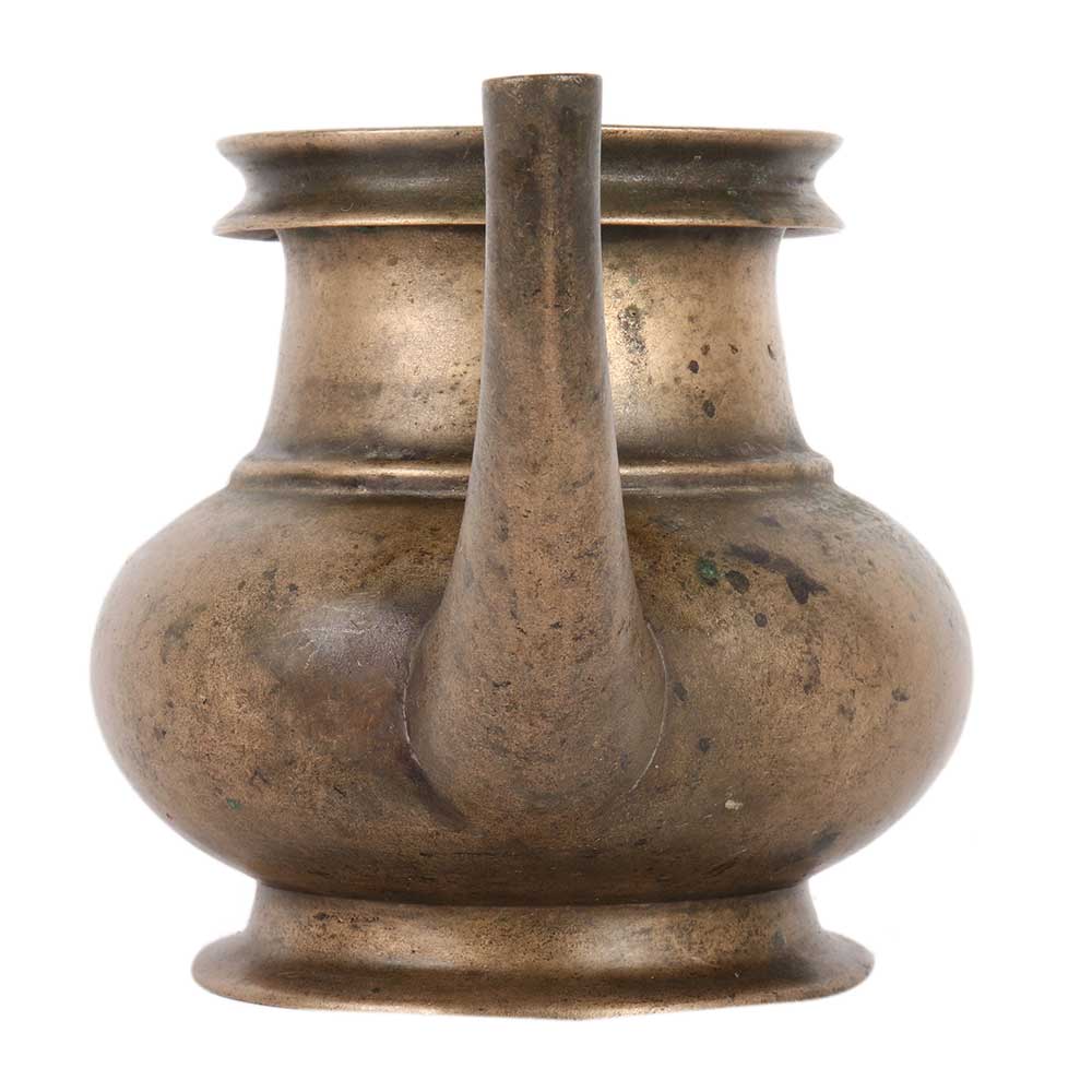 This brass kindi has a bulbous and arched foot. It has a cylindrical body with a flattened top and a high neck with a wide neck that allows the top of the container to be held between the fingers. The most prominent feature is the spout. It narrows and juts outwards from the body in a startling manner.
