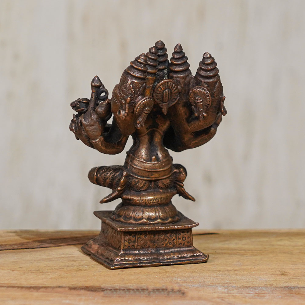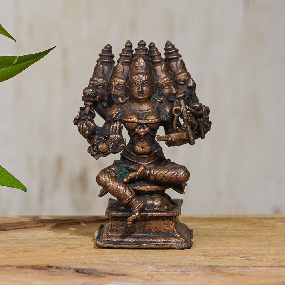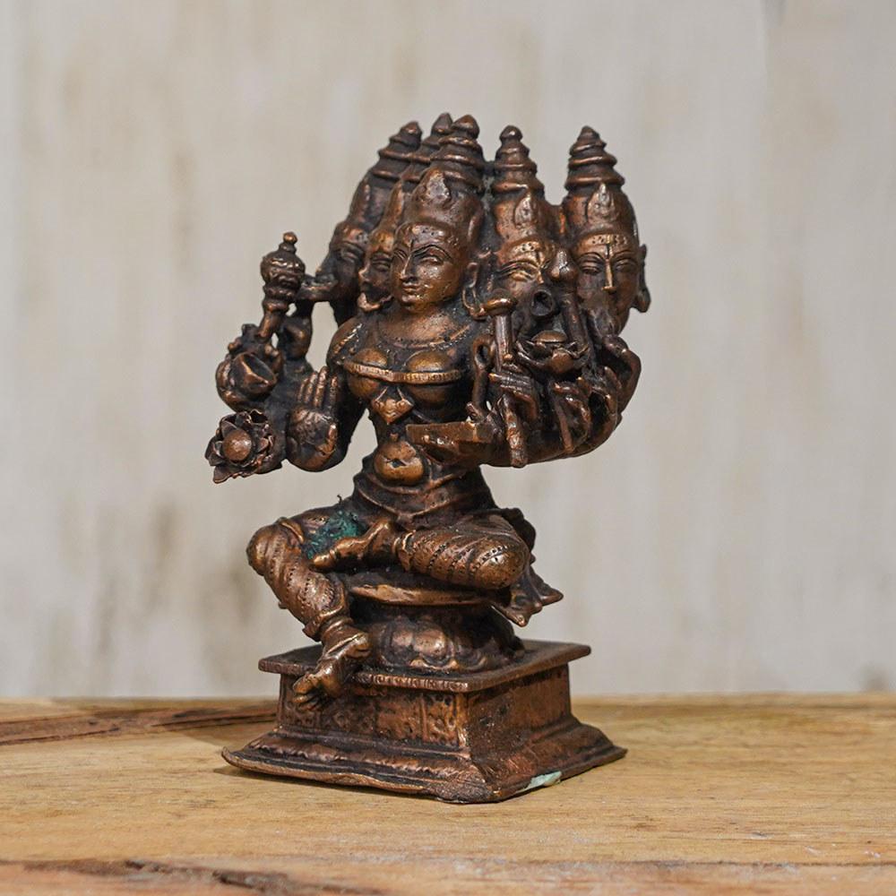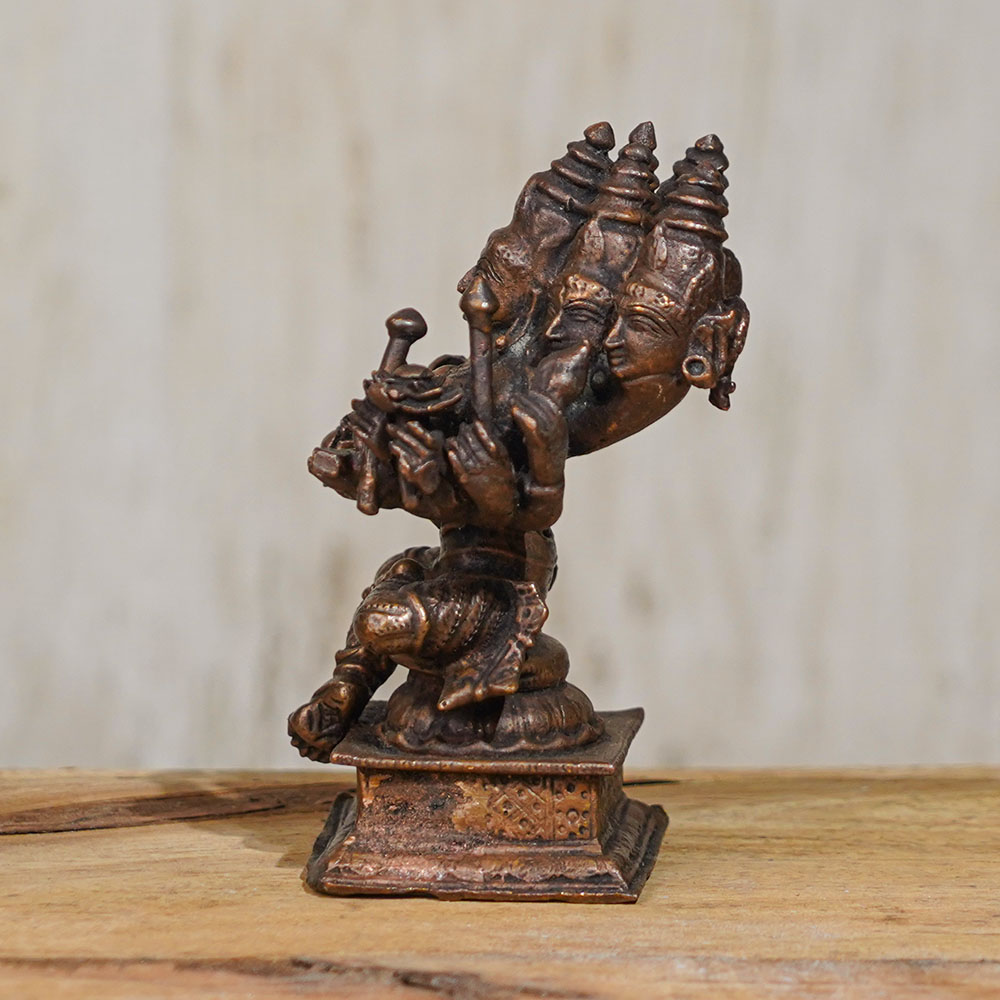 An exquisitely crafted Lord Brahma statue, the revered Hindu God known as "the creator of the world". This magnificent idol is meticulously handcrafted by highly skilled artisans using pure copper, a revered and auspicious metal in Indian culture. With intricate details and fine craftsmanship, this Lord Brahma murti is a testament to the rich cultural heritage of India. Ideal for worship in temples or as a revered addition to your home, this Lord Brahma idol is sure to enhance the spiritual ambiance of any space. This stunning statue of Lord Brahma showcases his five faces, each representing a cardinal direction, as well as his arms, holding sacred items and symbolizing his divine powers. Whether you are looking to buy Lord Brahma murti online for your personal worship or as a meaningful gift for festive or special occasions, this copper statue is a cherished choice. Embodying the divinity and grace of Lord Brahma, this exquisite god statue is a symbol of devotion and reverence, sure to bring blessings and prosperity to your life.