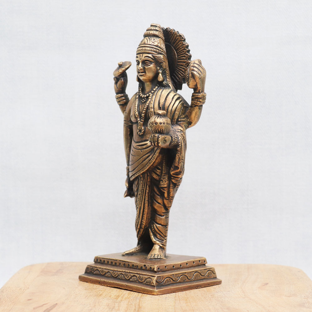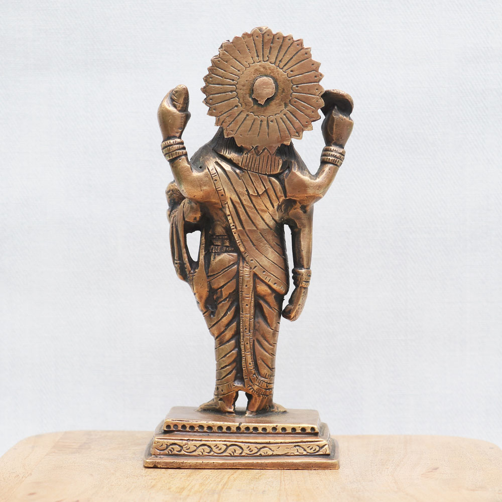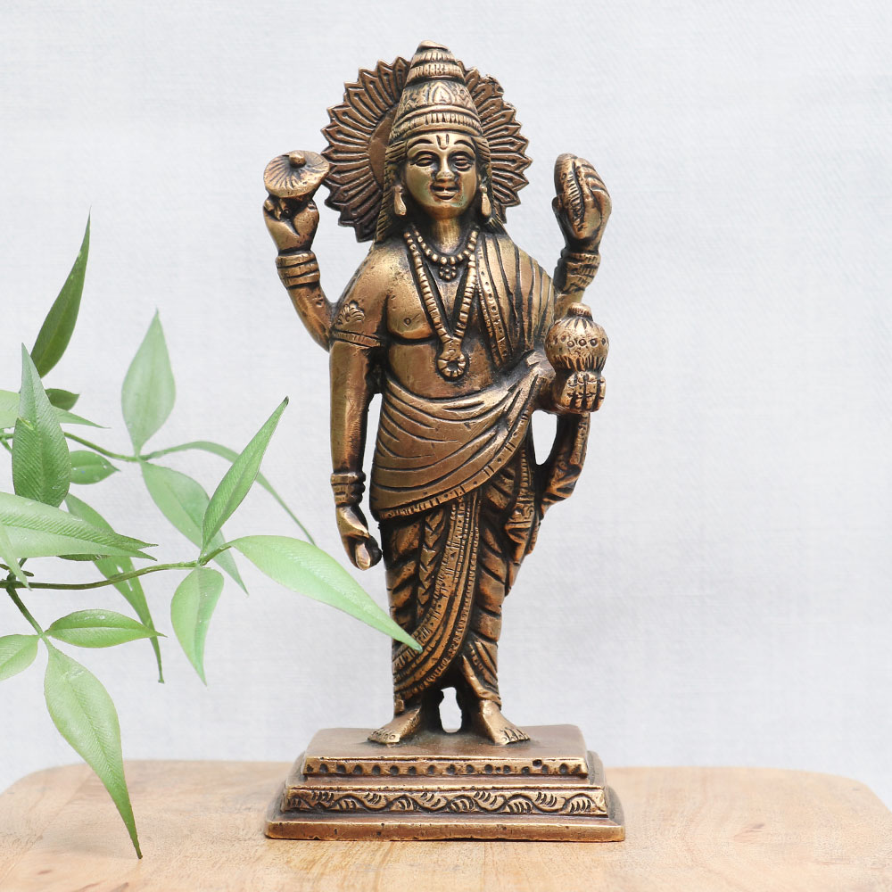 The Lord Dhanvantri Bronze Statue that is an extraordinary embodiment of Lord Vishnu's avatar, crafted by highly skilled and experienced Indian artisans. This masterpiece is intricately handcrafted using the finest quality bronze, ensuring an exquisite finish that exudes an antique charm. Ideal for adorning your home, office, restaurant, or hotel temple, this divine statue serves as a focal point for worship. Its intricate details and divine presence create an ambiance of spirituality and tranquillity. It also makes a remarkable addition to your vintage collection, lending an air of elegance and sophistication to any museum or exhibition. Beyond its spiritual significance, this stunning statue serves as a stunning decoration, enhancing the aesthetic appeal of any space. It can be an auspicious gift for your family, friends or relatives on special occasions or festive celebrations, imparting blessings and positive energy to their lives. Discover the divine essence of Hindu god statues online and elevate your reverence with this Lord Dhanvantri bronze idol, a true god showpiece that embodies divine grace and beauty.
