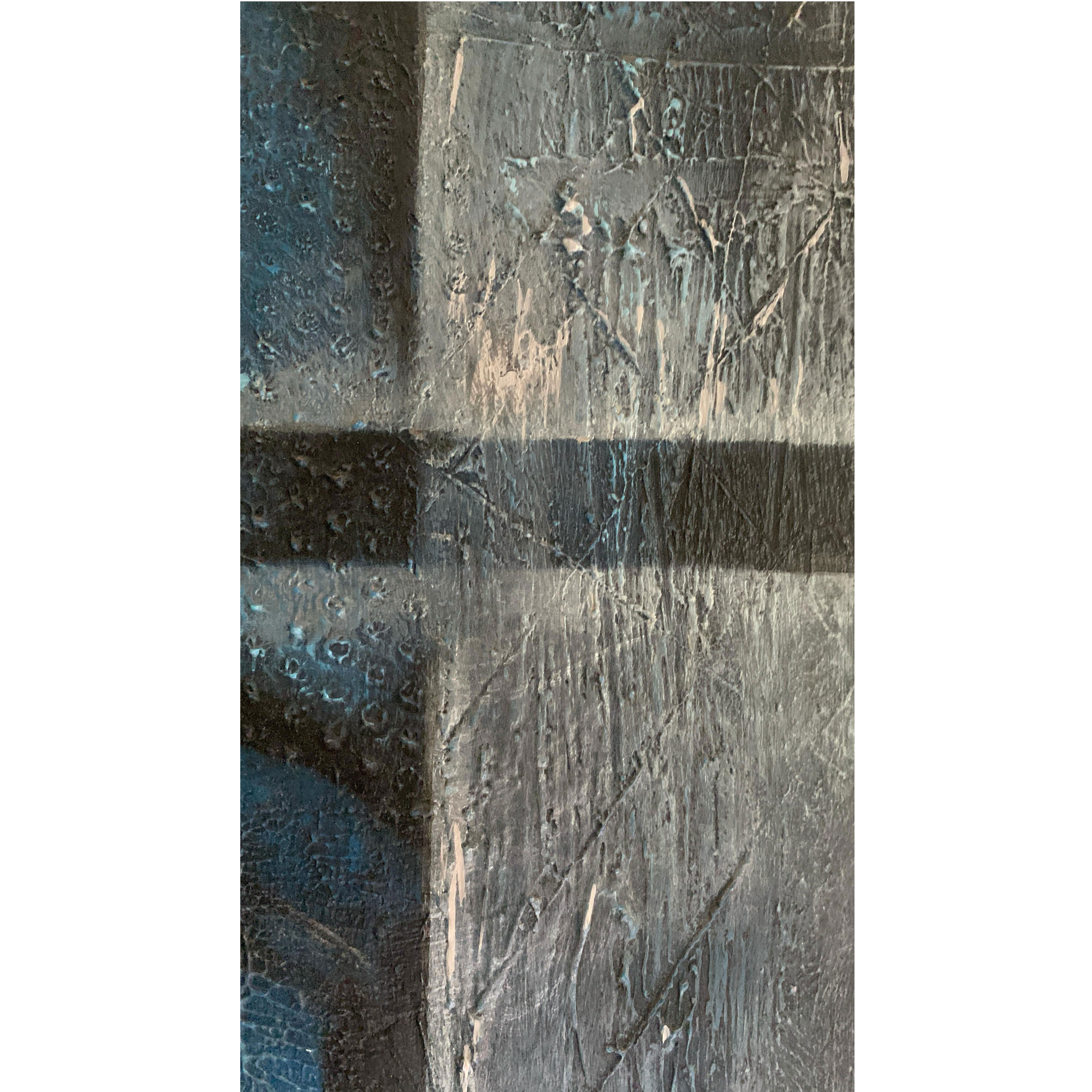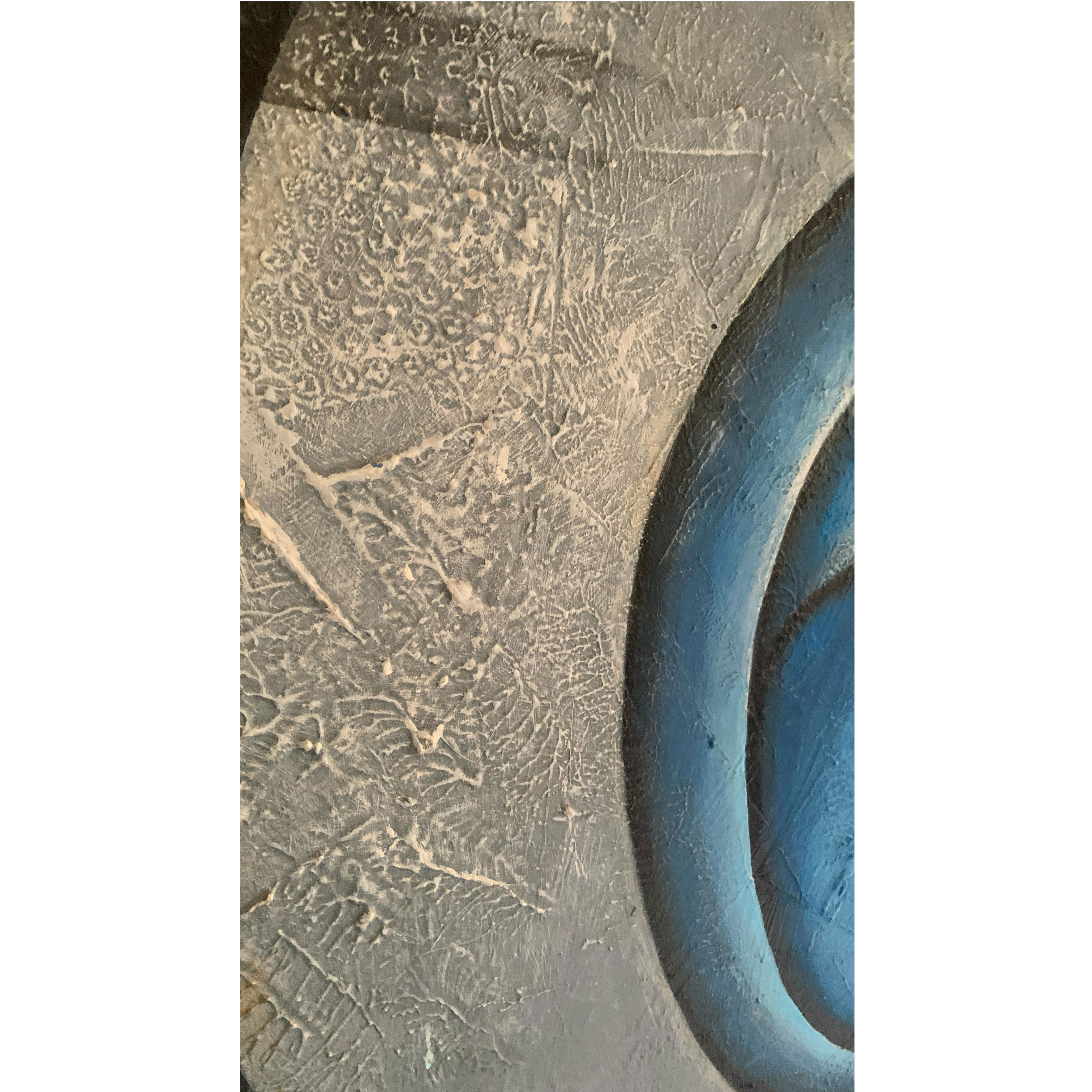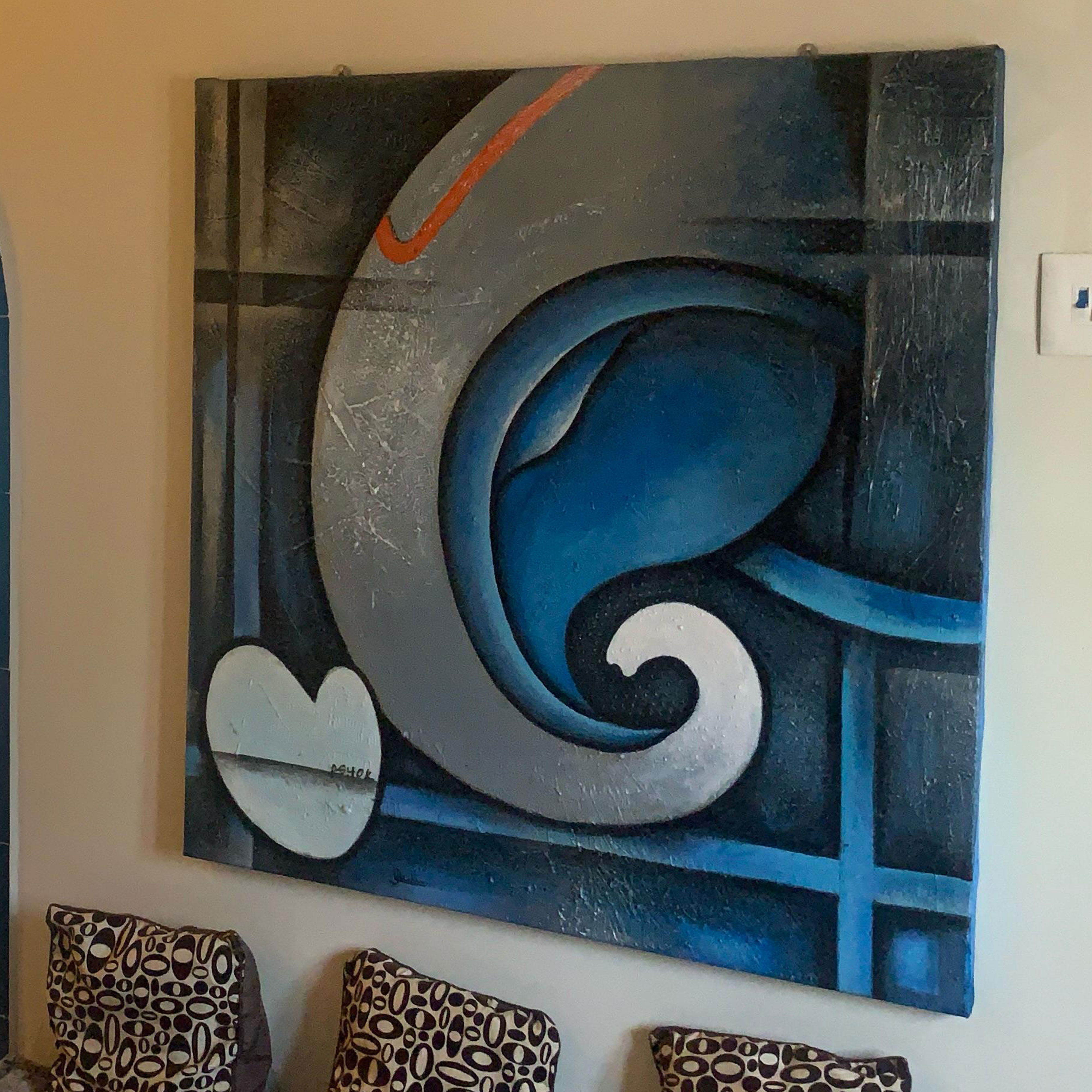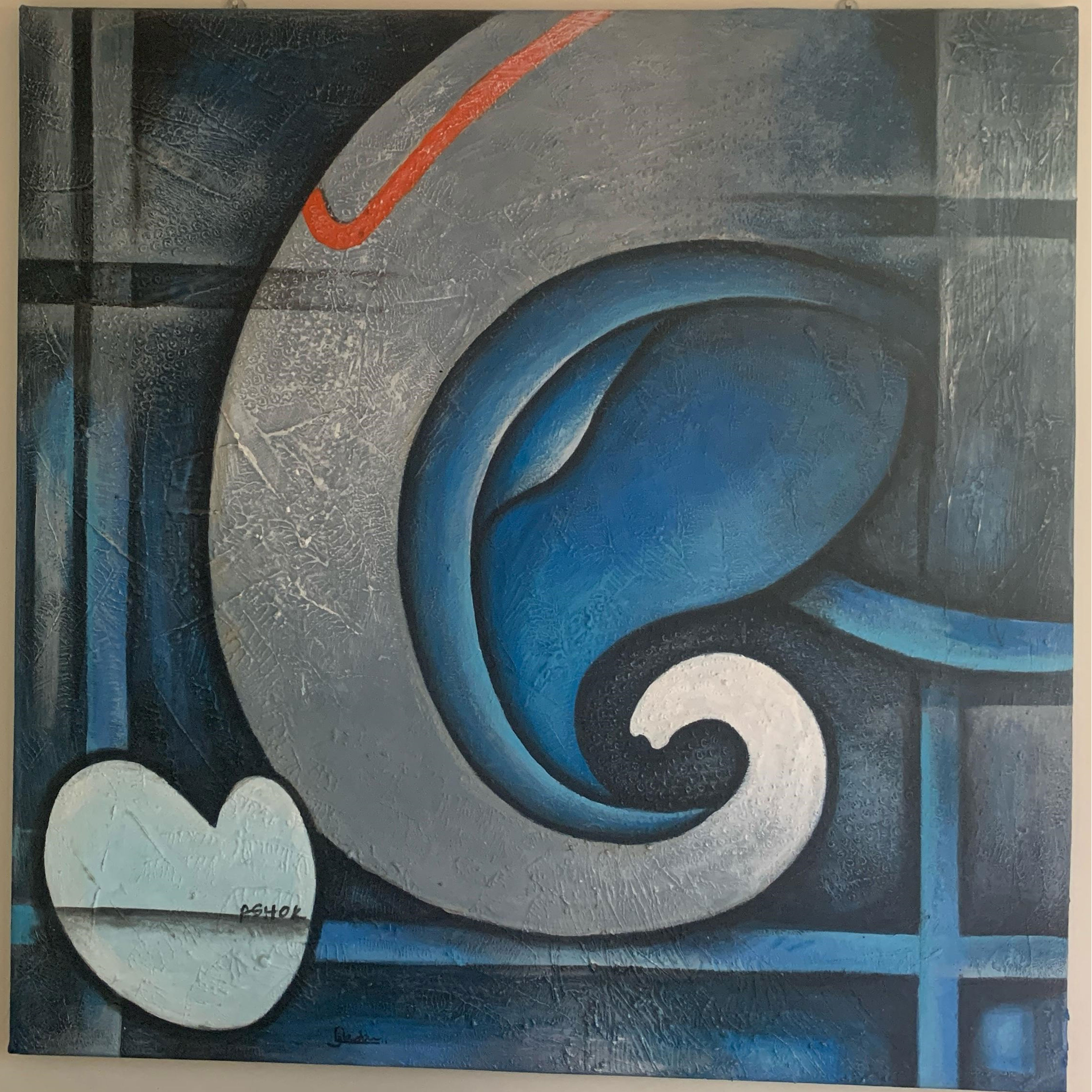 "Ganesha Ji," a 48 x 48 inch stretched acrylic on canvas, honors Lord Ganesha, the Hindu deity of beginnings and obstacle removal. Crafted with textured, heavy-bodied acrylics in blue, silver-grey, and white, this piece blends serenity and strength. Ganesha’s form is abstracted into fluid, wave-like patterns, with a white hand-shaped accent symbolizing blessings. Blue conveys divine tranquility, silver-grey reflects resilience, and white embodies purity. Geometric lines intersect to offer structure, echoing Ganesha’s guidance. This tactile, spiritual artwork fosters emotional connection, celebrating faith and inviting introspection through its vibrant depiction of divine clarity and balance.