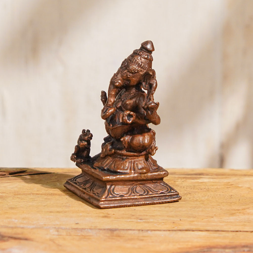 Buy this Lord Ganesha Murti online and invite the blessings of the elephant-headed deity into your home and heart. This exquisite copper statue of Lord Ganesha seated with his beloved vahana, the mouse known as Mushaka, is a masterpiece of craftsmanship. Handmade by skilled artisans, this idol of Lord Ganesha is made with intricate details that capture the divine essence of the Hindu god of wisdom, prosperity, and success. Made of high-quality copper, which is believed to be an auspicious metal in Hindu culture, this Lord Ganesha statue is not only a sacred symbol for worship, but also a beautiful piece of art that can enhance any space with its divine presence. Lord Ganesha is widely revered and worshipped in many Indian temples and homes, and this exquisite statue is a perfect addition to your prayer room or home altar. This Lord Ganesha with Mushaka statue is a meaningful gift for special or festive occasions, symbolizing blessings of wisdom, prosperity, and success for your loved ones. With its exquisite craftsmanship and spiritual significance, this Indian god statue is a cherished addition to any home, offering the divine presence of Lord Ganesha in your life.