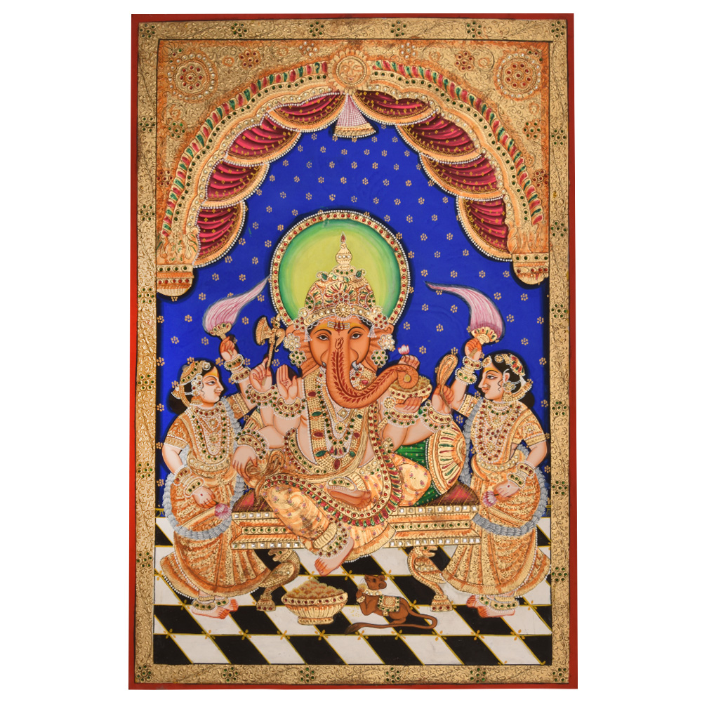 Lord Ganesha with his Two Wives Traditional Tanjore Painting. Made on board.
