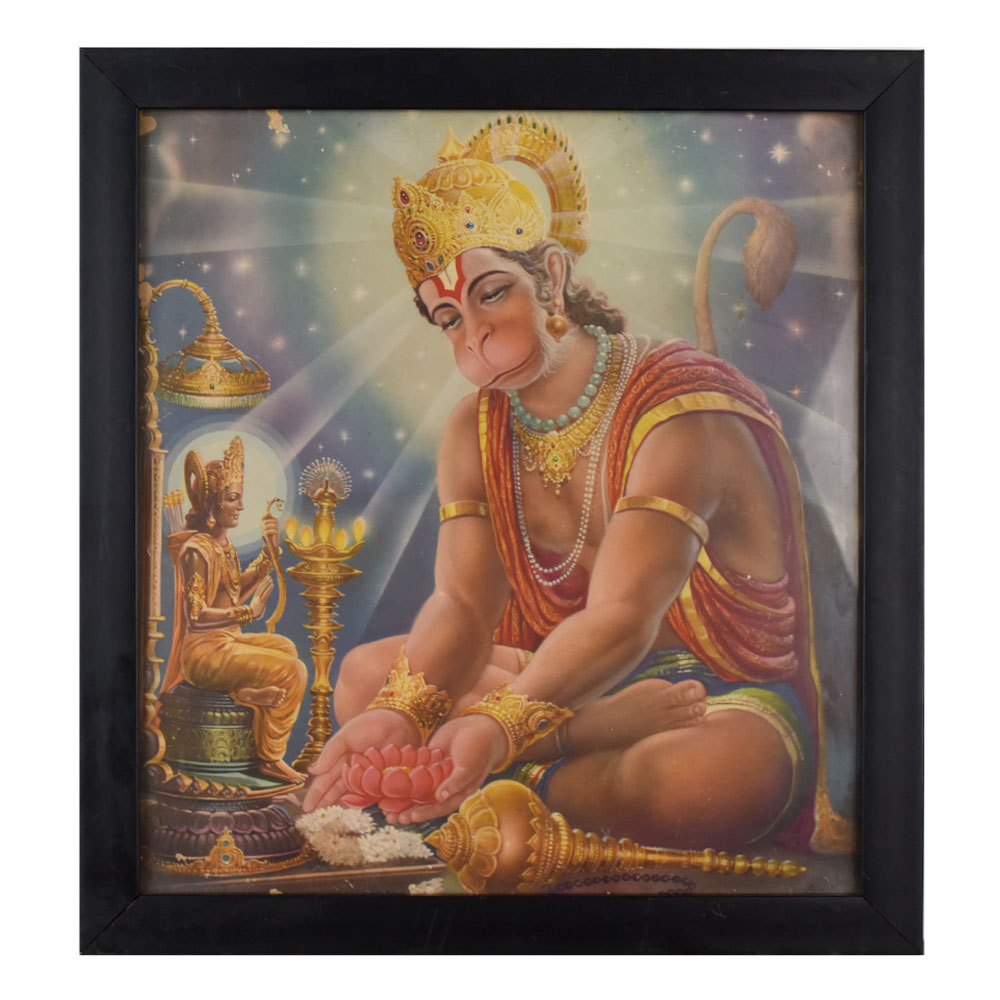 This vibrant calendar art print beautifully portrays Lord Hanuman in a devotional offering to Lord Rama, capturing the essence of devotion, humility, and divine service. Hanuman, adorned in resplendent golden ornaments, a crown studded with jewels, and flowing red garments, is shown seated with folded legs, holding a sacred lotus flower in both hands as an offering. His serene and focused expression reflects unwavering dedication and bhakti (devotion). In the background, Lord Rama is depicted seated gracefully on a royal throne, holding his bow and surrounded by a divine aura. An ornate golden lamp and intricate temple details further enhance the spiritual ambiance of the composition. The artist’s meticulous attention to color gradients, from Hanuman’s glowing form to the celestial night sky filled with stars, creates a captivating sense of depth and radiance. Originally designed in the traditional Indian calendar art style, this print combines religious symbolism with decorative appeal, making it both a devotional image and a collectible artwork. Perfect for prayer rooms, meditation spaces, or cultural displays, this framed print embodies the timeless values of loyalty, service, and spiritual surrender associated with Lord Hanuman, serving as a constant reminder of divine grace and protection.