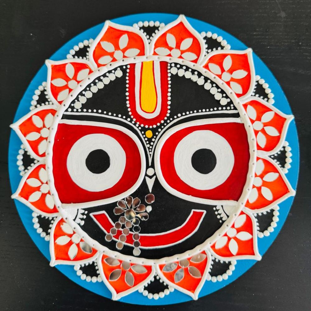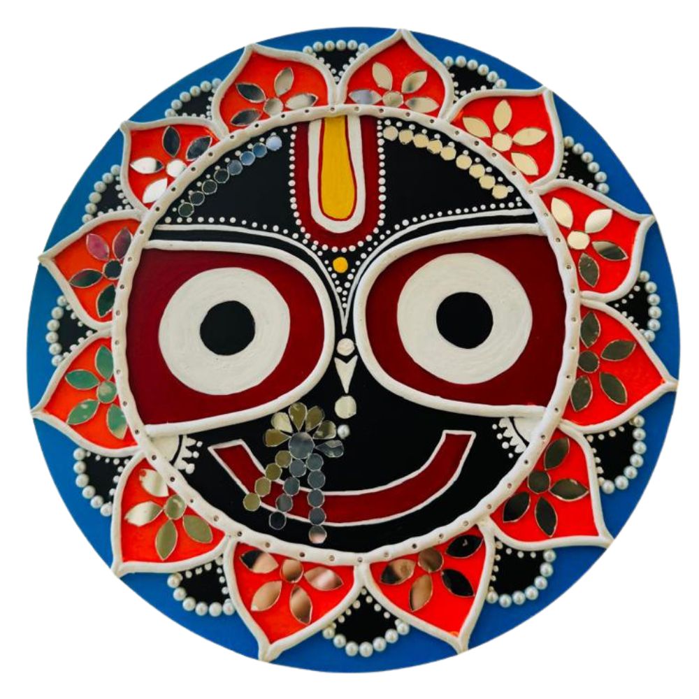 This Lippan wall decor features Lord Jagannath, symbolizing love, compassion, and spiritual growth. It's a beautiful way to bring spirituality into your home. This Lord Jagannath Lippan wall decor makes a thoughtful gift for devotees, friends, and family. It's a symbol of love, compassion, and spiritual growth.