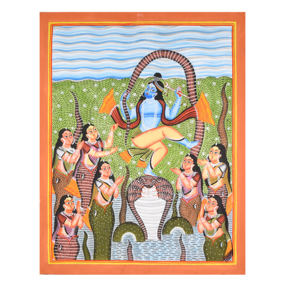 Depicts Lord Krishna dancing on the serpent Kaliya in classic Kalighat style Hand-painted using traditional pigments on cloth and paper Expressive figures, bold outlines, and rhythmic composition A mythological and culturally rich example of Bengali folk artProduct Specification