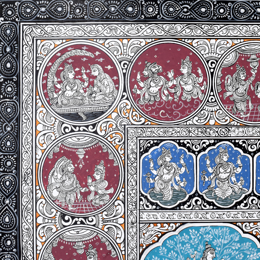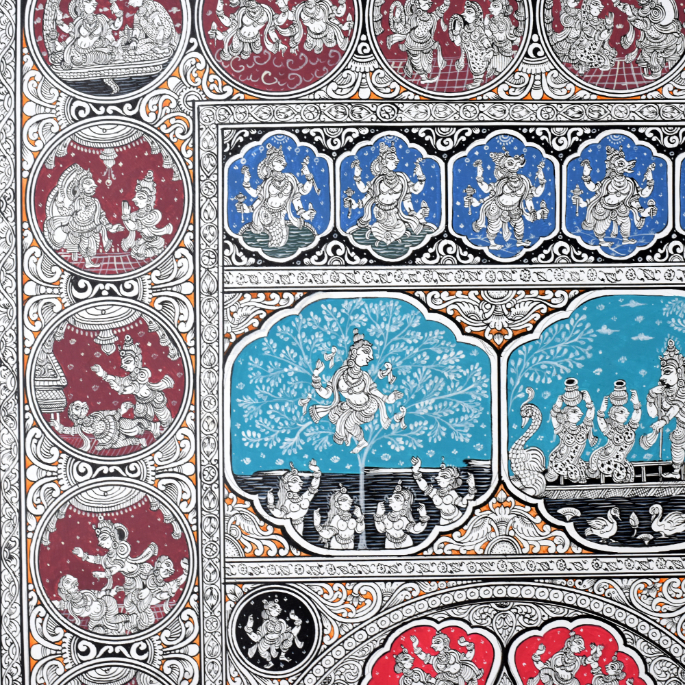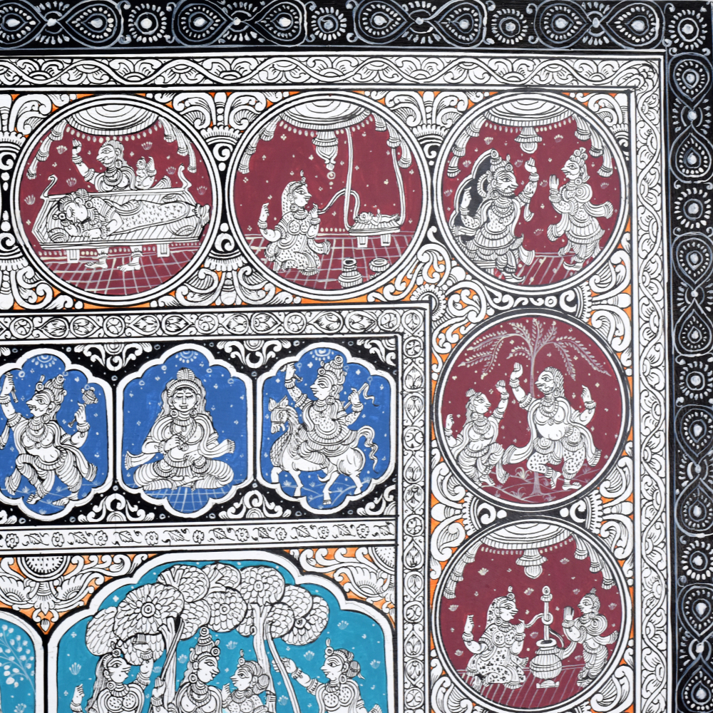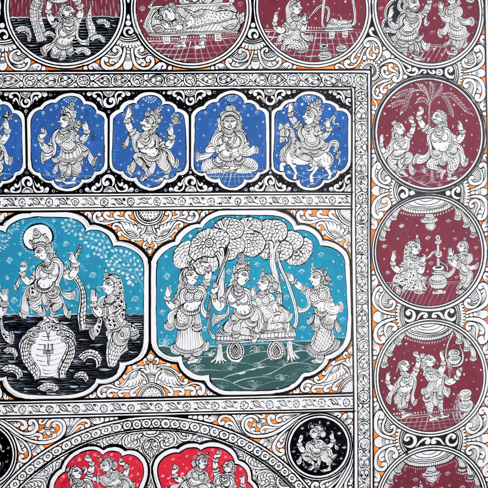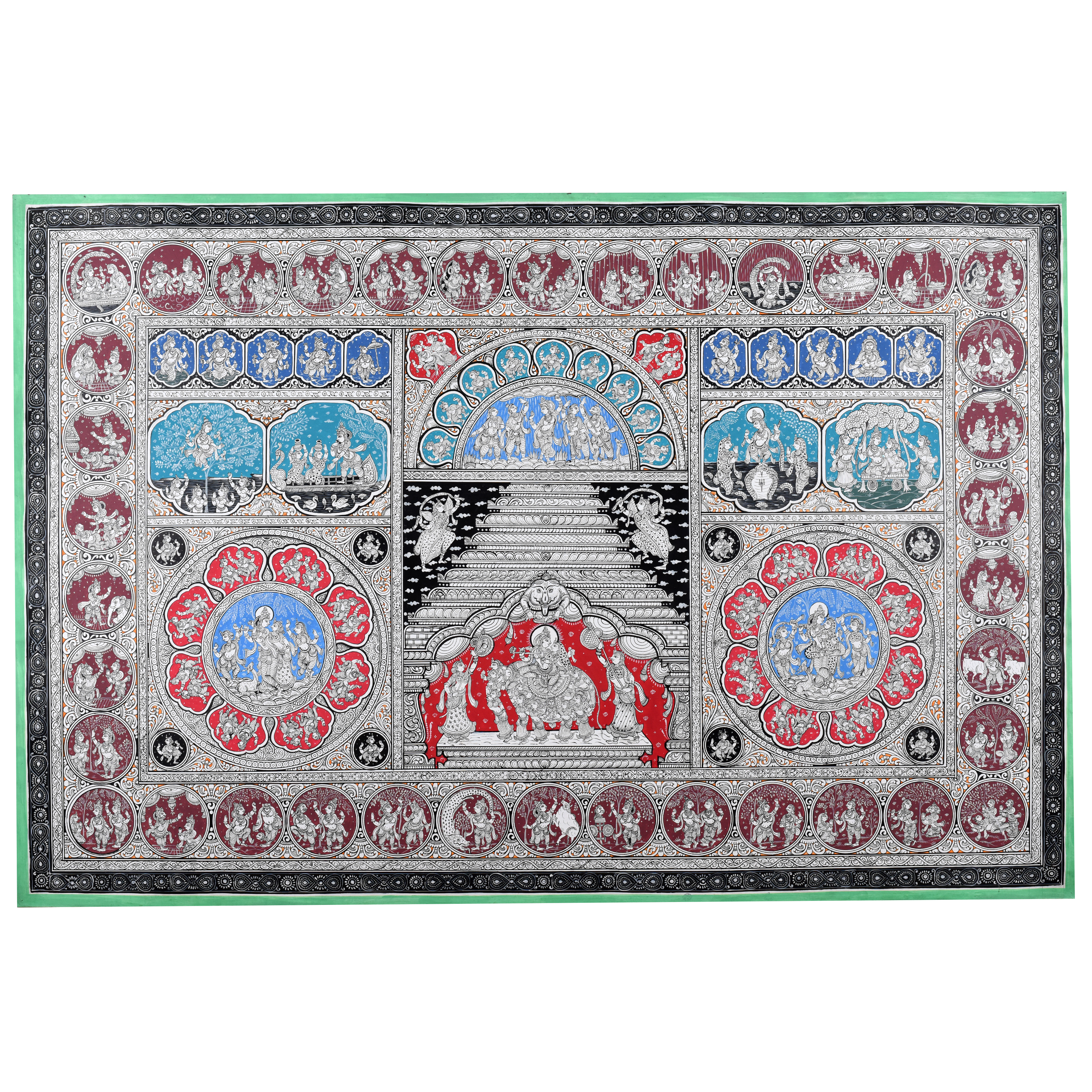 This Pattachitra painting showcases scenes from Lord Krishna's Leela (divine play) and intricately depicts the 10 avatars of Lord Vishnu, emphasizing his role in maintaining cosmic balance. The painting highlights Lord Krishna's divine adventures, focusing on his life as a child, his exploits with the Gopis, and his teachings, while also incorporating the 10 incarnations of Vishnu as part of the broader narrative. This Pattachitra painting, made on cloth paper, is a visual masterpiece that highlights the divine essence of Lord Vishnu through his 10 incarnations (avatars). The intricate brushwork and vibrant colors are indicative of the unique style of Odisha's Pattachitra art, which is known for its detailed illustrations and storytelling technique. Each section of the painting represents different phases of Lord Vishnu’s divine purpose on Earth, beginning with his first incarnation, Matsya (the fish), and concluding with the prophecy of Kalki, the future avatar. The central part of the painting is dedicated to Lord Krishna, the most prominent incarnation of Vishnu in Hindu mythology. Lord Krishna, known for his role as a divine cowherd, protector, and guide, is portrayed in various forms. He is shown playing his flute, surrounded by the Gopis, a symbol of his divine love and devotion. This portrayal is a key part of Krishna's Leela, which highlights his playful and affectionate nature, a contrast to the more serious and heroic depictions of other avatars like Rama or Parashurama. The avatars of Vishnu are arranged around Krishna, symbolizing the eternal cycle of creation and destruction. Each avatar, whether Matsya (the fish), Varaha (the boar), or Narasimha (the man-lion), is depicted with symbolic elements that capture the essence of their stories. For example, Matsya is shown as a fish emerging from the waters, signifying the creation of life after a deluge, while Kurma, the tortoise, holds the earth on his back, symbolizing stability. The avatars' forms range from the peaceful Vamana, the dwarf who subdues the demon king Bali, to the fierce Narasimha, who rips apart the demon Hiranyakashipu, illustrating Vishnu’s intervention to protect the righteous. The depiction of the Buddha represents Vishnu's teachings of compassion and enlightenment, while Kalki is symbolized as a future warrior, signaling the restoration of righteousness in a time of chaos. The borders of the painting are richly adorned with fine details of small divine figures, adding further depth to the story being told. These borders contain additional motifs and gods, further enhancing the spiritual theme. Each character and scene are rendered with deep care, reflecting the artist's devotion and skill in bringing these sacred stories to life. The painting is not just a work of art but a visual representation of the deep philosophical and spiritual teachings associated with Lord Vishnu’s avatars. The careful use of color, design, and imagery invites the viewer to delve into the sacred stories, embodying the essence of these divine beings and their importance in Hindu mythology. This Pattachitra painting is a testament to the enduring power of tradition, culture, and faith. The 10 Avatars of Lord Vishnu depicted in the painting are: Matsya (The Fish), Kurma (The Tortoise), Varaha (The Boar), Narasimha (The Man-Lion), Vamana (The Dwarf), Parashurama (The Axe-wielding Sage), Rama (The Prince of Ayodhya), Krishna (The Divine Cowherd), Buddha (The Enlightened One), Kalki (The Future Avatar)