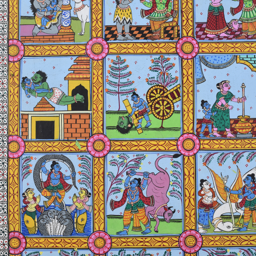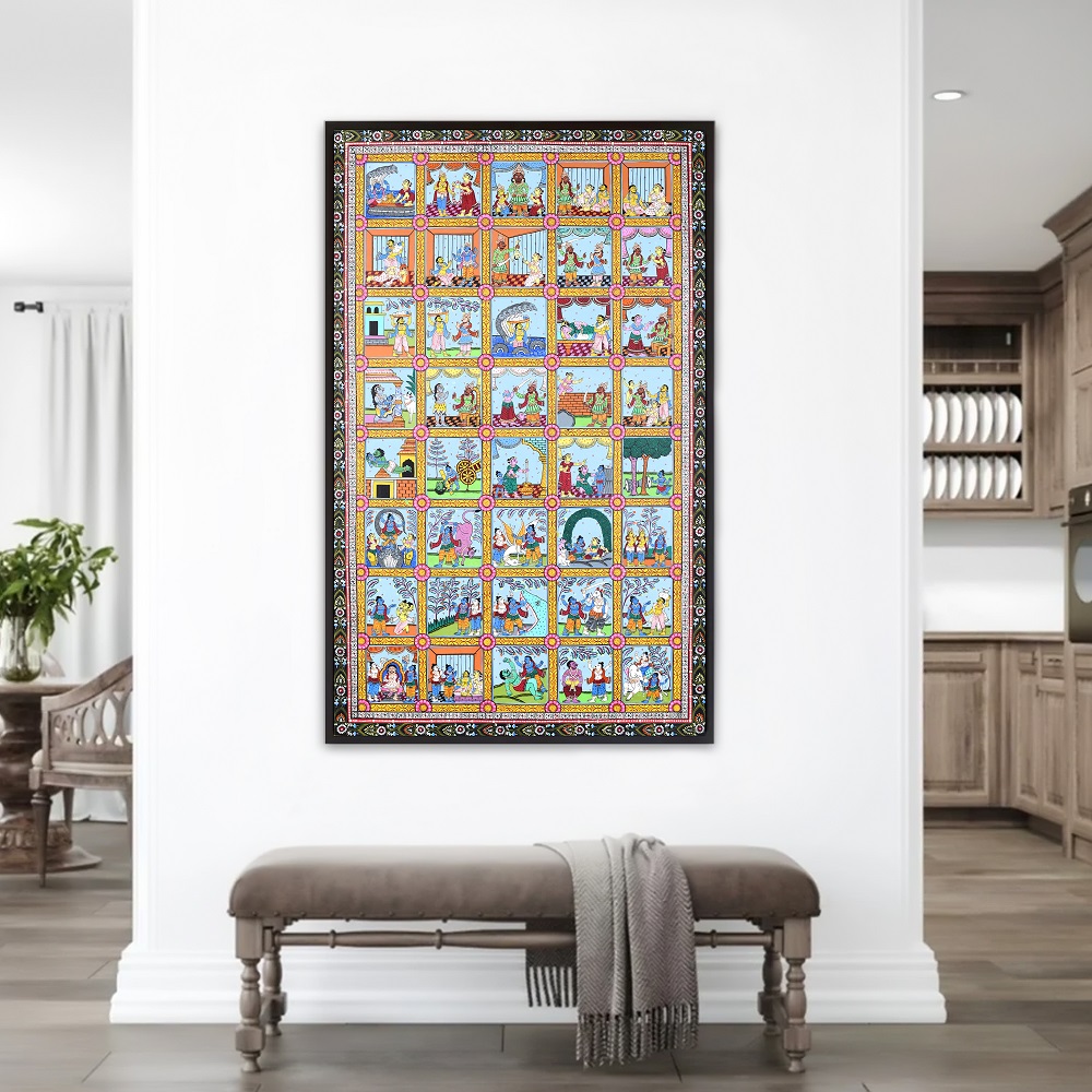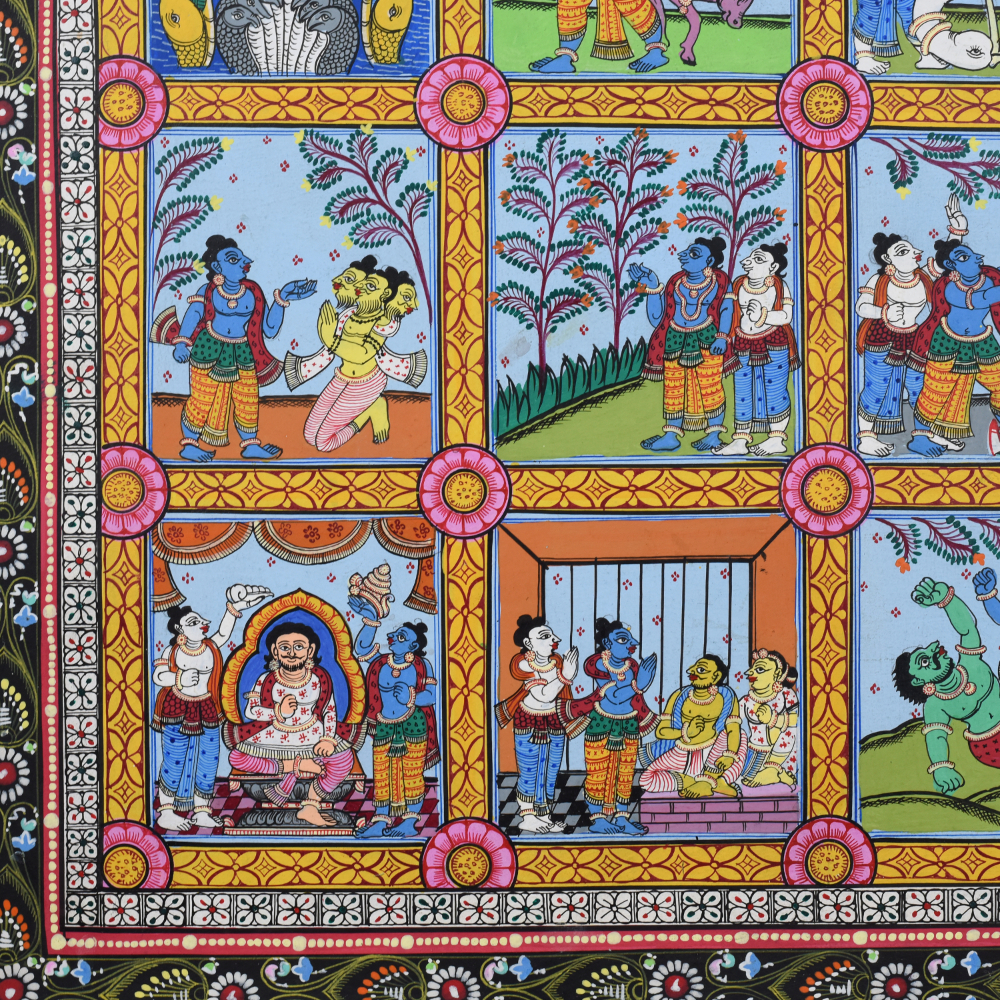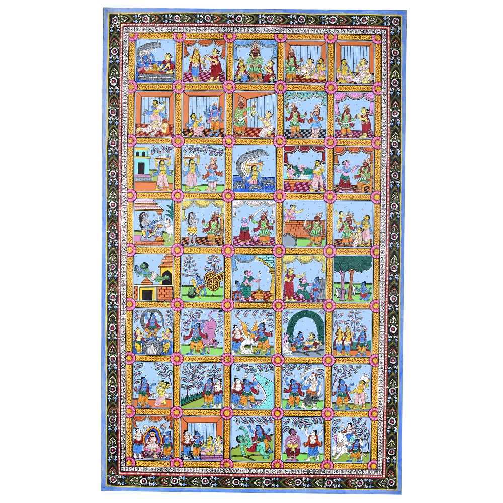 This cloth paper pattachitra painting depicts various scenes from the life of Lord Krishna, a revered deity in Hinduism, known for his playful, loving, and heroic acts. The artwork is a traditional Indian Pattachitra style, which is distinguished by intricate detailing, vibrant colors, and the portrayal of mythological and religious stories. In this painting, the different phases of Krishna’s life are artistically captured, beginning with his birth and childhood to his later years as an adult and a deity. The painting is divided into several square panels, each illustrating a significant event in Krishna’s life. Starting from the top left, one can see the birth of Krishna, his divine appearance in the prison cell of his mother Devaki, and his miraculous escape from the prison to be raised by his foster parents, Nanda and Yashoda, in Gokul. As we move down the panels, we see Krishna’s mischievous childhood exploits, such as stealing butter from the gopis (milkmaids), a story that reflects his playful and charming nature. The painting beautifully captures Krishna’s relationship with Radha, his divine consort, and his role in the Vrindavan forest, where he enchants the gopis with his flute-playing, signifying his deep spiritual connection to his devotees. The middle panels continue to depict Krishna’s transition into adulthood. They showcase his role as a protector, where he vanquishes numerous demons sent by the evil king Kamsa, his uncle. One panel might show Krishna defeating the serpent Kaliya or subduing the demon Putana, symbolic of Krishna’s divine power and his role as a protector of the righteous. Later on, the painting moves towards depicting Krishna’s participation in the Mahabharata war, where he serves as Arjuna’s charioteer. At the bottom of the painting, scenes showing Krishna’s divine role as a deity, including his ascent to the heavens, remind viewers of his eternal significance in Hindu philosophy and devotion. The vibrant color scheme of reds, blues, and greens, combined with the flowing, intricate lines, emphasizes the mystical nature of Krishna’s journey from his earthly life to his divine essence. This Pattachitra painting serves not only as a visual storytelling medium but also as an artistic celebration of Lord Krishna’s divine play and teachings, representing the deep spiritual connection that his devotees experience through his life and miracles.