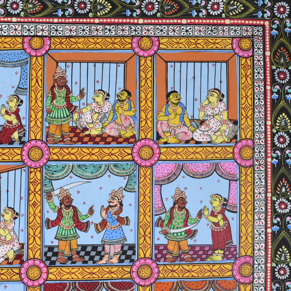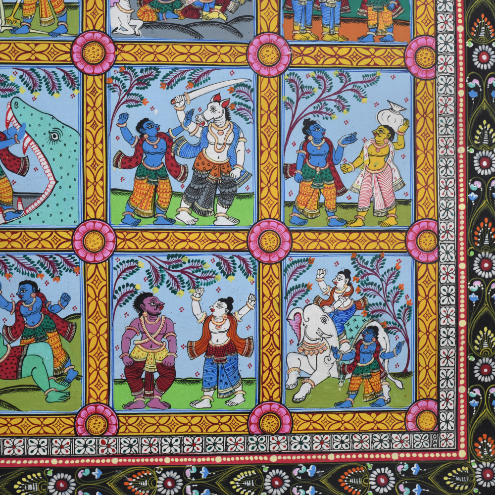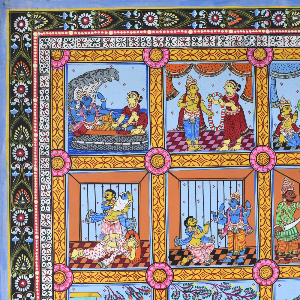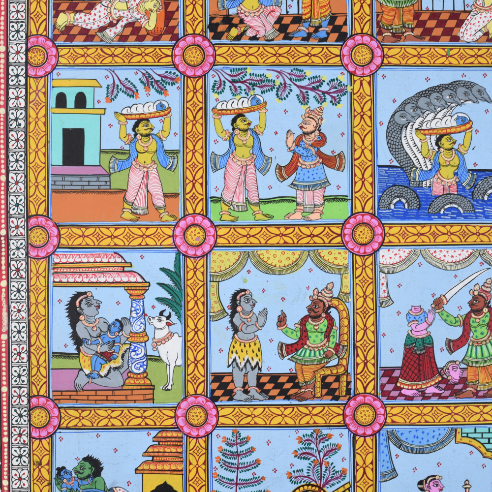 This cloth paper pattachitra painting depicts various scenes from the life of Lord Krishna, a revered deity in Hinduism, known for his playful, loving, and heroic acts. The artwork is a traditional Indian Pattachitra style, which is distinguished by intricate detailing, vibrant colors, and the portrayal of mythological and religious stories. In this painting, the different phases of Krishna’s life are artistically captured, beginning with his birth and childhood to his later years as an adult and a deity. The painting is divided into several square panels, each illustrating a significant event in Krishna’s life. Starting from the top left, one can see the birth of Krishna, his divine appearance in the prison cell of his mother Devaki, and his miraculous escape from the prison to be raised by his foster parents, Nanda and Yashoda, in Gokul. As we move down the panels, we see Krishna’s mischievous childhood exploits, such as stealing butter from the gopis (milkmaids), a story that reflects his playful and charming nature. The painting beautifully captures Krishna’s relationship with Radha, his divine consort, and his role in the Vrindavan forest, where he enchants the gopis with his flute-playing, signifying his deep spiritual connection to his devotees. The middle panels continue to depict Krishna’s transition into adulthood. They showcase his role as a protector, where he vanquishes numerous demons sent by the evil king Kamsa, his uncle. One panel might show Krishna defeating the serpent Kaliya or subduing the demon Putana, symbolic of Krishna’s divine power and his role as a protector of the righteous. Later on, the painting moves towards depicting Krishna’s participation in the Mahabharata war, where he serves as Arjuna’s charioteer. At the bottom of the painting, scenes showing Krishna’s divine role as a deity, including his ascent to the heavens, remind viewers of his eternal significance in Hindu philosophy and devotion. The vibrant color scheme of reds, blues, and greens, combined with the flowing, intricate lines, emphasizes the mystical nature of Krishna’s journey from his earthly life to his divine essence. This Pattachitra painting serves not only as a visual storytelling medium but also as an artistic celebration of Lord Krishna’s divine play and teachings, representing the deep spiritual connection that his devotees experience through his life and miracles.