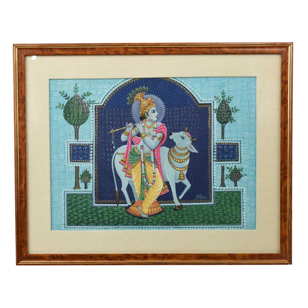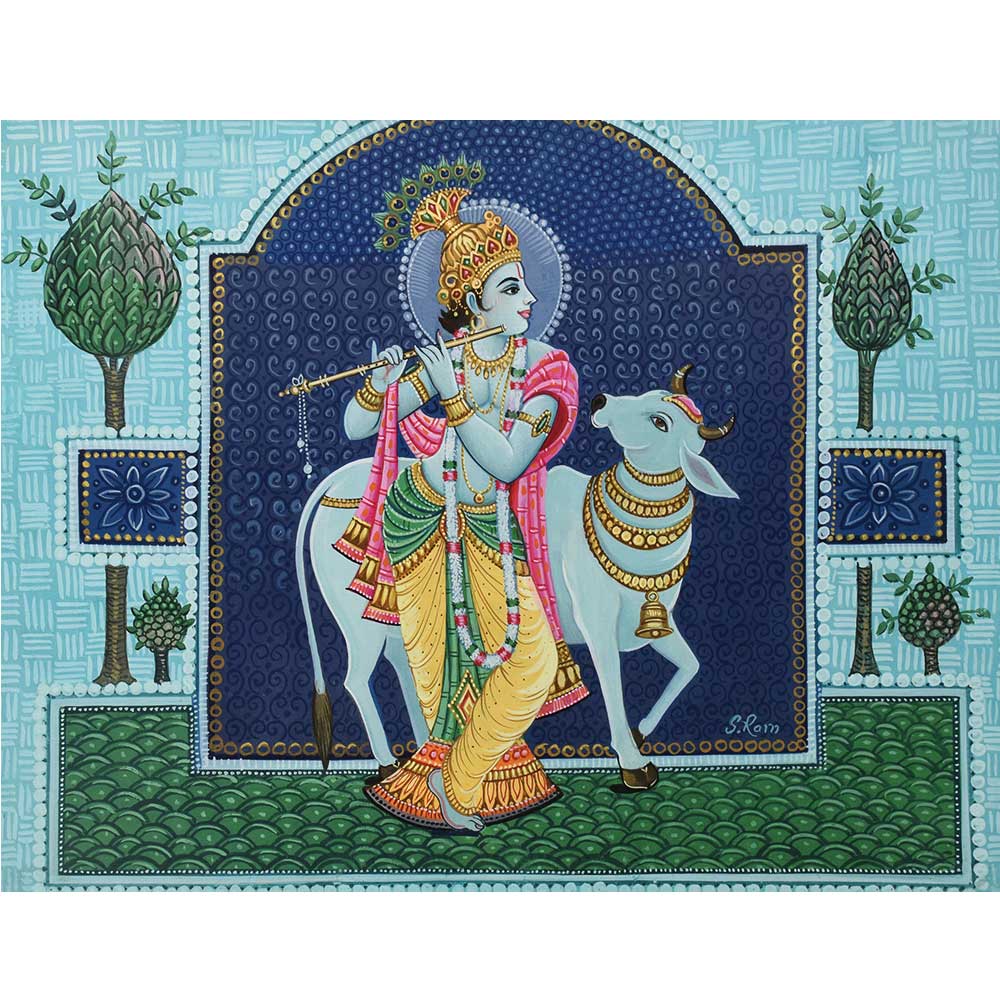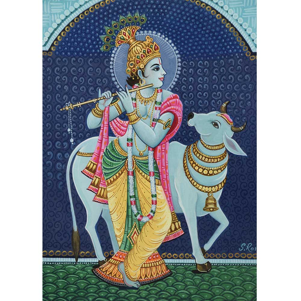 A picturesque Calendar Art Painting of Shri Krishna playing flute with Kamdhenu on his side.
