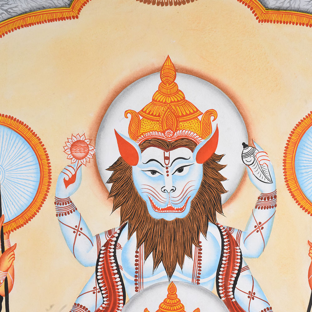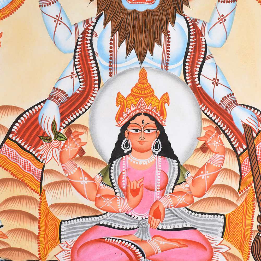 Depicts Lord Narasimha with Goddess Lakshmi in traditional Kalighat iconography Hand-painted using traditional pigments on cloth and paper Bold outlines, expressive faces, and symbolic composition typical of Kalighat art A meaningful blend of devotion, folklore, and Bengali artistic heritageProduct Specification