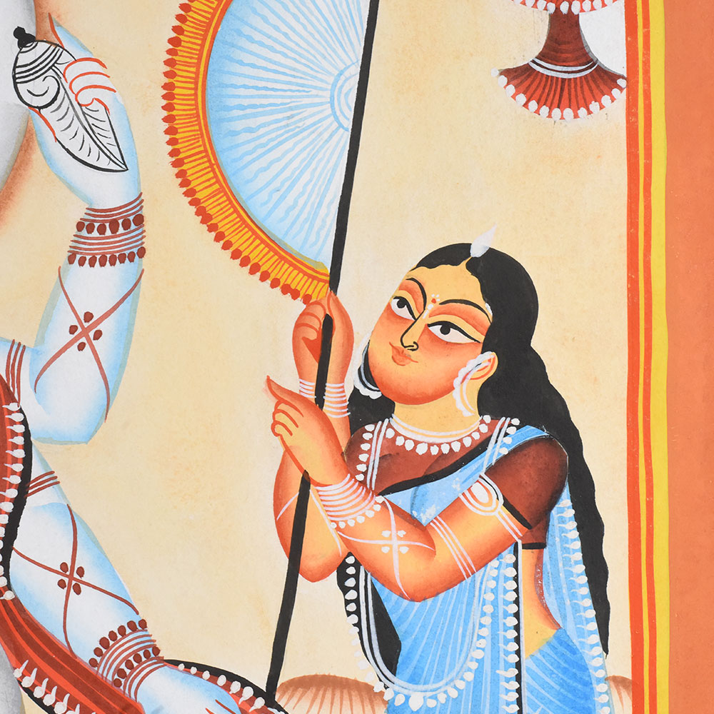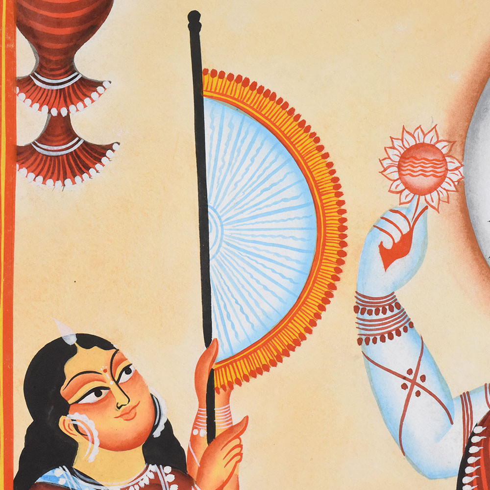 This powerful Kalighat painting on cloth and paper vividly represents a sacred Vaishnavite theme, rendered in the unmistakable Kalighat folk style of 19th-century Bengal. The painting depicts Lord Narasimha, the fierce lion-headed incarnation of Lord Vishnu, shown in a protective and divine stance, while Goddess Lakshmi is seated serenely on a blooming lotus below him. The contrast between Narasimhas intense, guardian-like presence and Lakshmis calm, benevolent expression creates a deeply symbolic and visually striking composition. Flanking the central deity are two female attendants holding ceremonial flywhisks, reinforcing the divine status of the figures and lending rhythmic balance to the artwork. The arched shrine-like frame, stylized waves, and floating lotus leaves at the bottom add layers of narrative and spiritual meaning, symbolizing purity, cosmic order, and divine protection. Bold black outlines, flat areas of color, and expressive facial features are classic Kalighat traits, designed to convey emotion and meaning with immediacy rather than realism. Executed using traditional hand-applied pigments on cloth backed with paper, the painting reflects the skill and storytelling sensibility of Kalighat patuas (artists). Every element from the exaggerated eyes to the ornate crown and jewelry, serves a symbolic purpose rooted in Hindu mythology. This artwork is both a devotional image and a cultural artifact, embodying the transition of Kalighat art from temple souvenirs to collectible folk masterpieces.