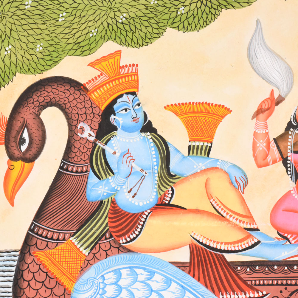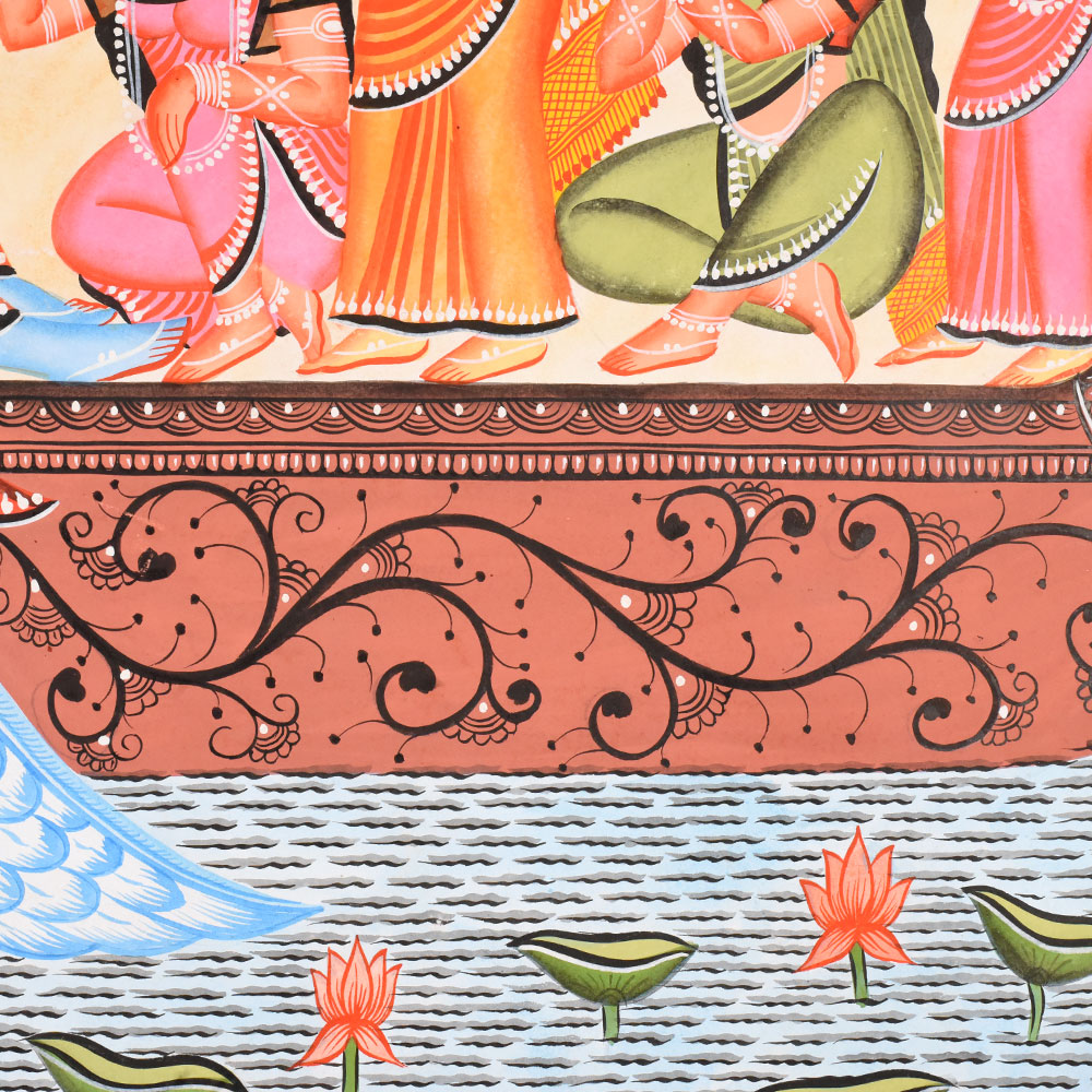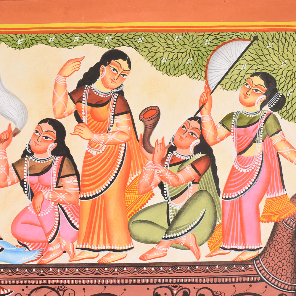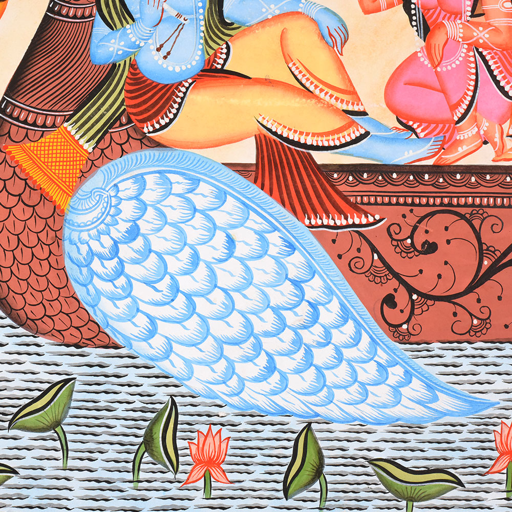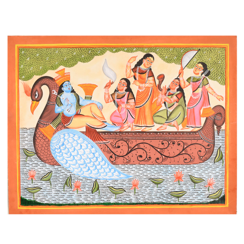This Kalighat painting on cloth and paper portrays a lively mythological river journey, blending divine presence with festive courtly life in the distinctive Kalighat folk style. At the center of the composition is Lord Vishnu, identified by his blue complexion and serene expression, reclining gracefully inside an ornate makara-shaped boat. The boat, richly decorated with scrolling floral motifs and a sculpted bird-like prow, glides across stylized waters filled with lotus flowers and floating leaves, creating a rhythmic visual flow. Surrounding Vishnu are elegantly dressed female attendants, shown mid-gesture with flywhisks, fans, and musical instruments. Their animated poses, tilted heads, and expressive almond-shaped eyes convey movement, devotion, and celebration, as if accompanying the deity in a royal procession. Vishnus relaxed posture contrasts beautifully with the lively attendants, reinforcing his divine calm amid worldly motion. The makaras large wing and curved neck dominate the left side, adding both symbolic protection and visual drama to the scene. The river is depicted through repeated horizontal lines, a classic Kalighat technique that maintains flatness while suggesting motion. Lotus buds and leaves punctuate the water surface, while dense green foliage arches across the top of the painting, framing the narrative like a natural canopy. The palette is warm and harmoniousreds, oranges, greens, and bluesoutlined with confident black lines. A bold decorative border encloses the scene, enhancing its iconic, shrine-like quality. Executed on cloth and paper, this painting reflects the Kalighat artists skill in transforming mythological themes into accessible, story-rich imagery that feels both devotional and theatrical, capturing a moment of divine leisure and celebration.