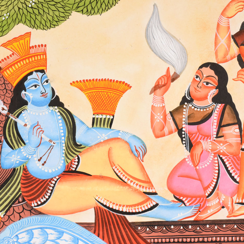 Flat colors, bold outlines, and decorative borders typical of Kalighat painting