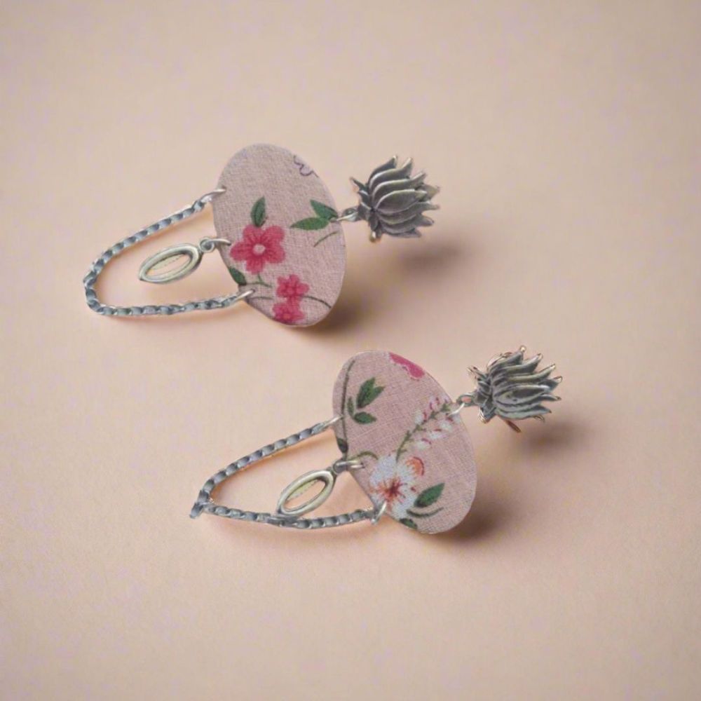 Style these earrings with pastel kurtas, cotton sarees, or minimalist fusion outfits, and store them in a dry pouch to preserve the fabric print and silver finish.
