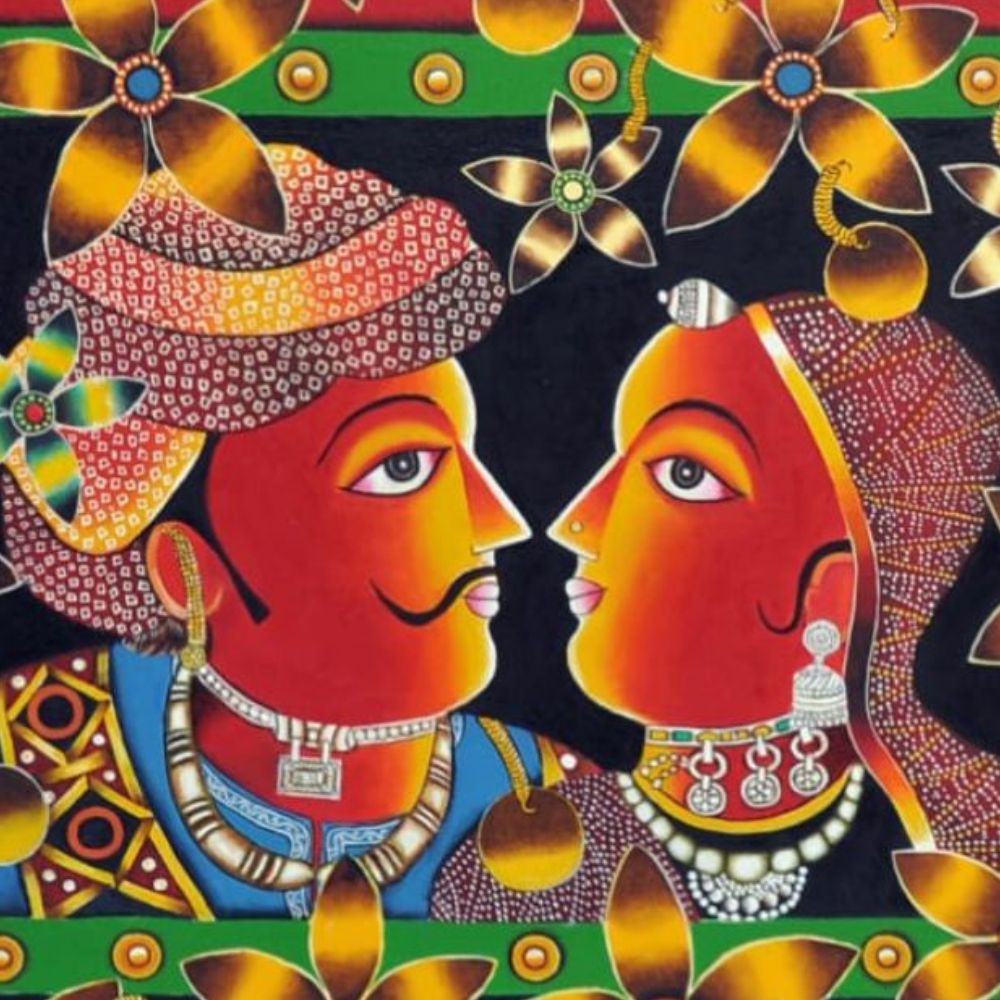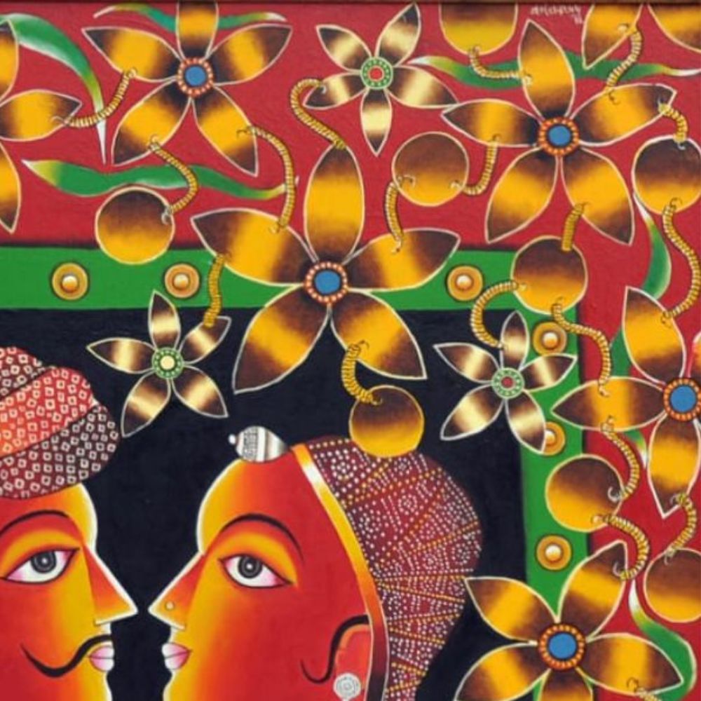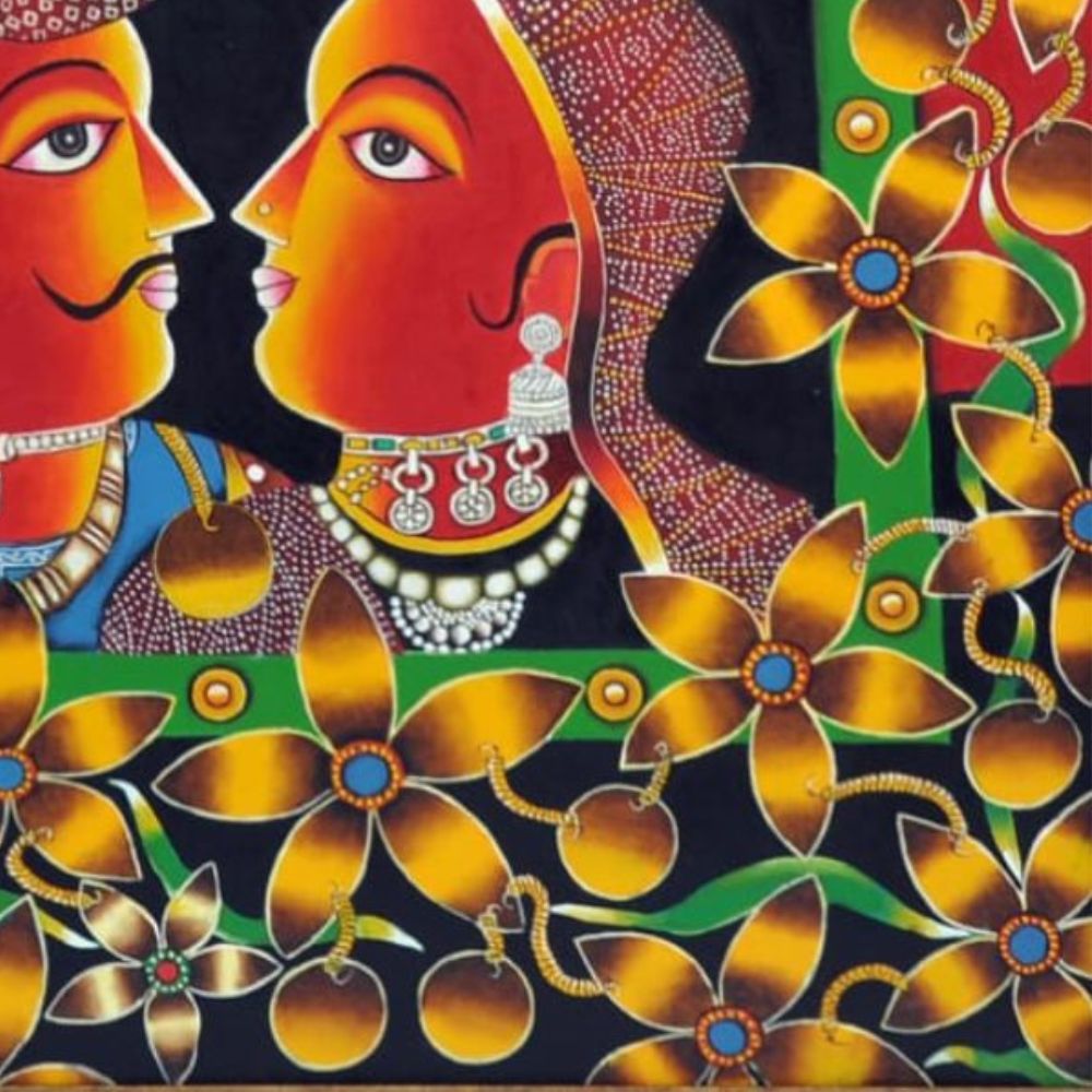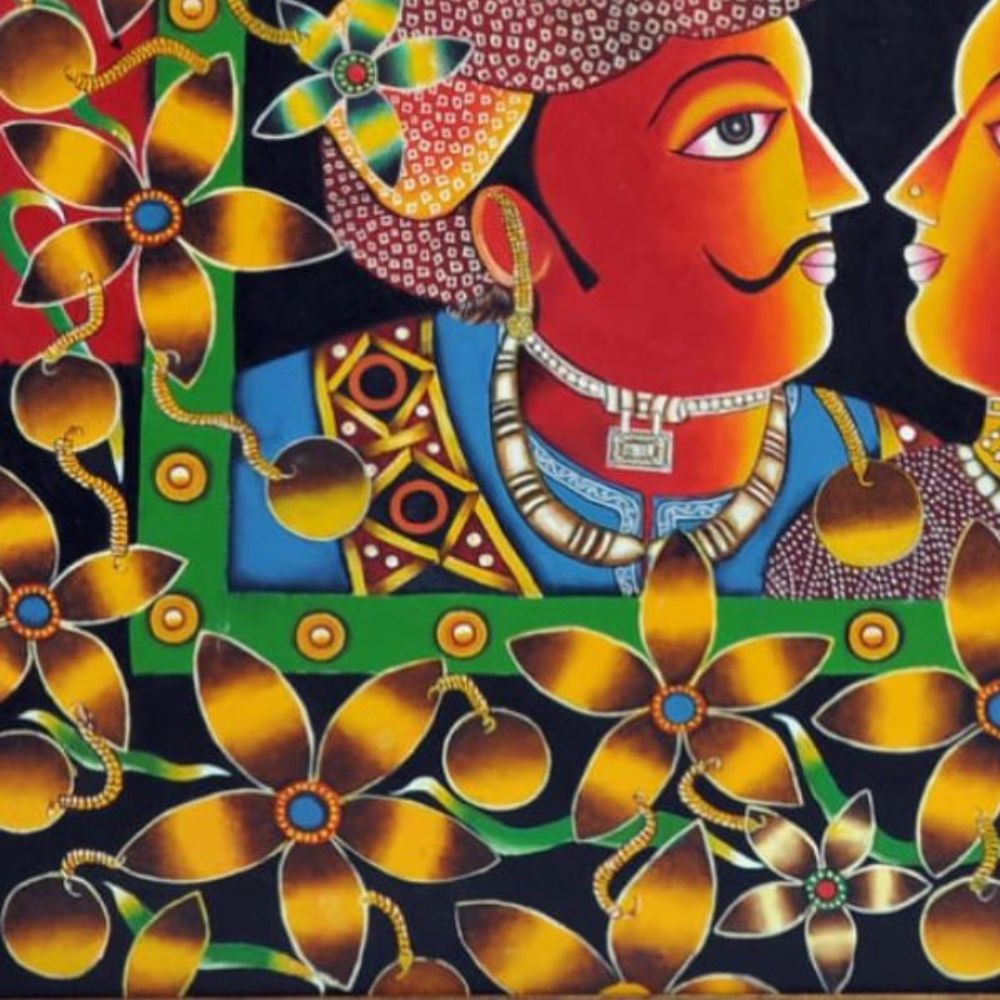 "Love Affair" is a captivating Acrylic on Canvas painting that beautifully captures the timeless romance of a traditional Indian couple. With bold strokes, intricate patterns, and a vibrant color palette, the painting depicts a man and woman locked in a gaze that speaks of devotion, intimacy, and eternal love. Their expressive faces, adorned with traditional jewelry and attire, reflect the richness of Indian culture and heritage. The couple is framed within a lush border of radiant golden-yellow flowers that bloom around them, symbolizing growth, prosperity, and the blossoming of love. The use of red, green, and black backgrounds enhances the dramatic contrast, while the floral embellishments create a rhythmic harmony that draws the viewer’s attention to the central figures. The artist’s mastery in acrylics brings out striking textures, vivid shades, and fine detailing, making this artwork both visually dynamic and emotionally evocative. Ideal for home décor, art galleries, or gifting, "Love Affair" is more than a painting—it is a poetic representation of companionship and cultural beauty. It elevates any space with warmth, passion, and elegance.