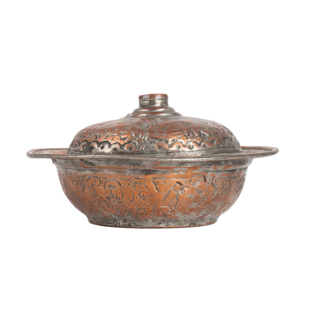 A lovely bowl engraved with beautiful designs that will be a real eye-catcher for your visitors and guests. Buy this copper bowl online from our website, which is made by skilled Indian craftsmen in Islamic art to give a long lasting impression of decoration. This copper bowl was used for serving food on the dining table. It has a lid to protect the food. You can keep this bowl for decoration and collection, but we do not recommend using it for serving food as it is used and old. Keep your small items in it or put it on the table, shelf, desk, dining table or reception to beautify the interior. Its Islamic art engraving makes it a perfect gift for any special and festive occasion for your family, friends and relatives.